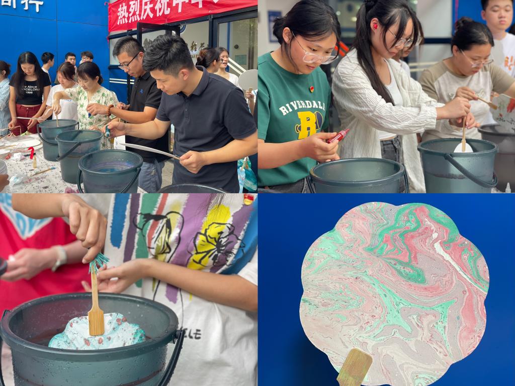 “以漆为媒,以扇为纸”漆扇绘制:以扇子为载体,以天然大漆为主要材料,在水中滴入各色大漆,扇子放置其中,以点、甩、弹、划等手法,在水面绘出图案效果,再晕染在扇面,形成妙趣横生、自然天成的图案。