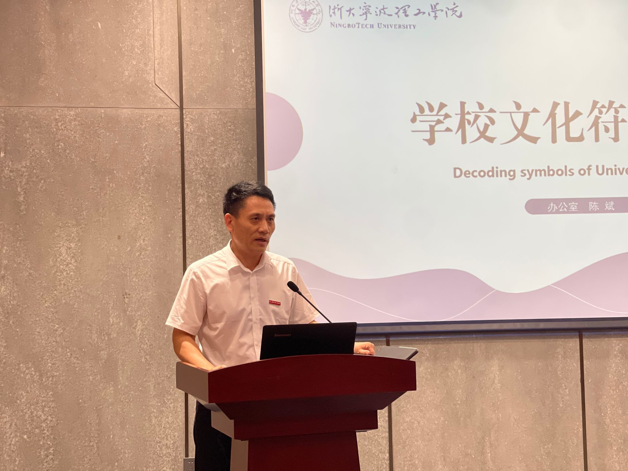 陈斌从学校创办缘由,名字来源、校标变迁等多维度向大家生动介绍了浙大宁波理工学院的历史沿革,向新生们深入阐释了校训“明德弘毅,开物启新”的深刻内涵与传承价值,并带领新生从校园标志景观出发,一步步探索并解码校园文化的独特魅力。最后,陈斌动情地讲述了学校成立学生爱心基金背后的感人故事,寄语新生要怀揣对大学生活的无限热爱,传承并发扬浙大宁波理工学院的优秀文化。