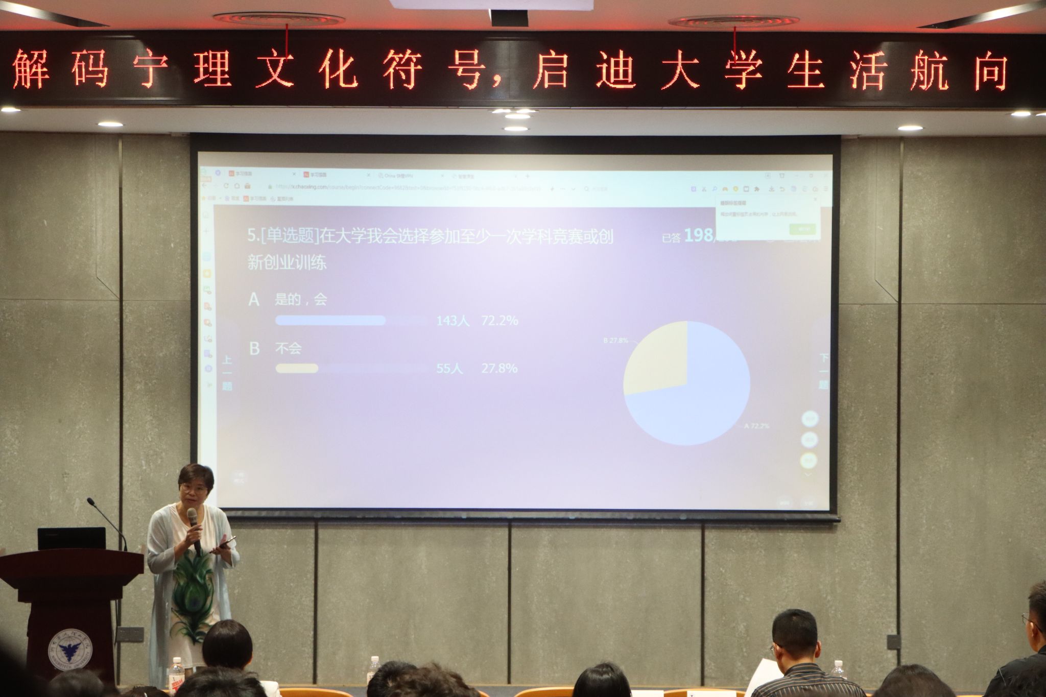 沈昊宇通过现场问卷调查结果,对新生大学生涯规划情况进行分析,通过“创新从大学起航”“大学因你而不同”“你因大学更精彩”三个篇章,对如何规划大学生活进行全面解答。最后,沈昊宇寄语新生,要珍惜大学时光,积极参加学科活动,在这个充满机遇与挑战的时代中明确奋斗目标,追求多样化发展。