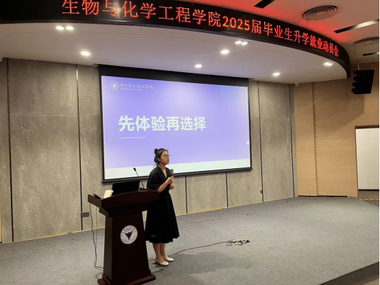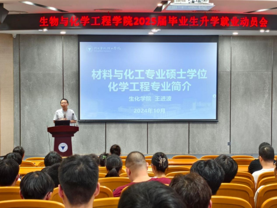 为切实做好2025届毕业生升学就业服务工作,提高毕业生升学就业竞争力,10月18日下午,生化学院在启新大讲堂召开2025届毕业生升学就业动员会,现场邀请了中国石化镇海炼化公司和宁波三生生物科技有限公司进行校园招聘宣讲。生化学院副院长王进波、学工办主管闫雪茹、教务办副主管张斐飞、教务办老师代冬梅、2025届毕业班全体同学参加此次会议,会议由毕业班辅导员段然主持。