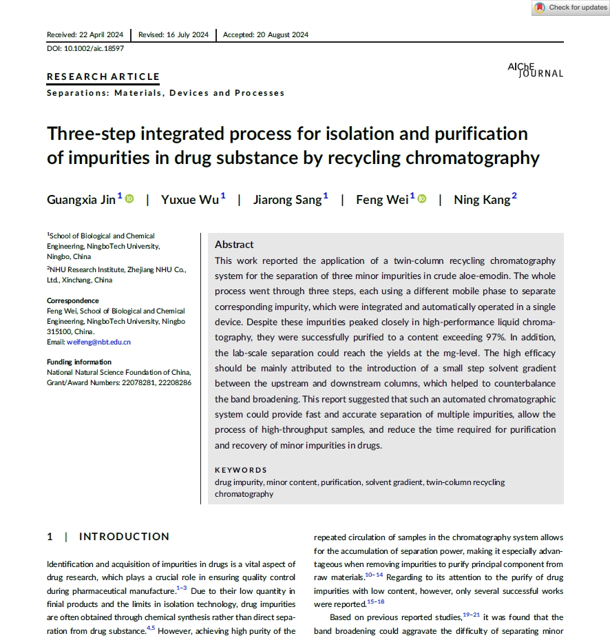 近日,生化学院金广夏博士在色谱分离领域取得重要进展,相关成果在以“Three-step integrated process for isolation and purification of impurities in drug substance by recycling chromatography”为题在AIChE Journal上发表(https://doi.org/10.1002/aic.18597)。