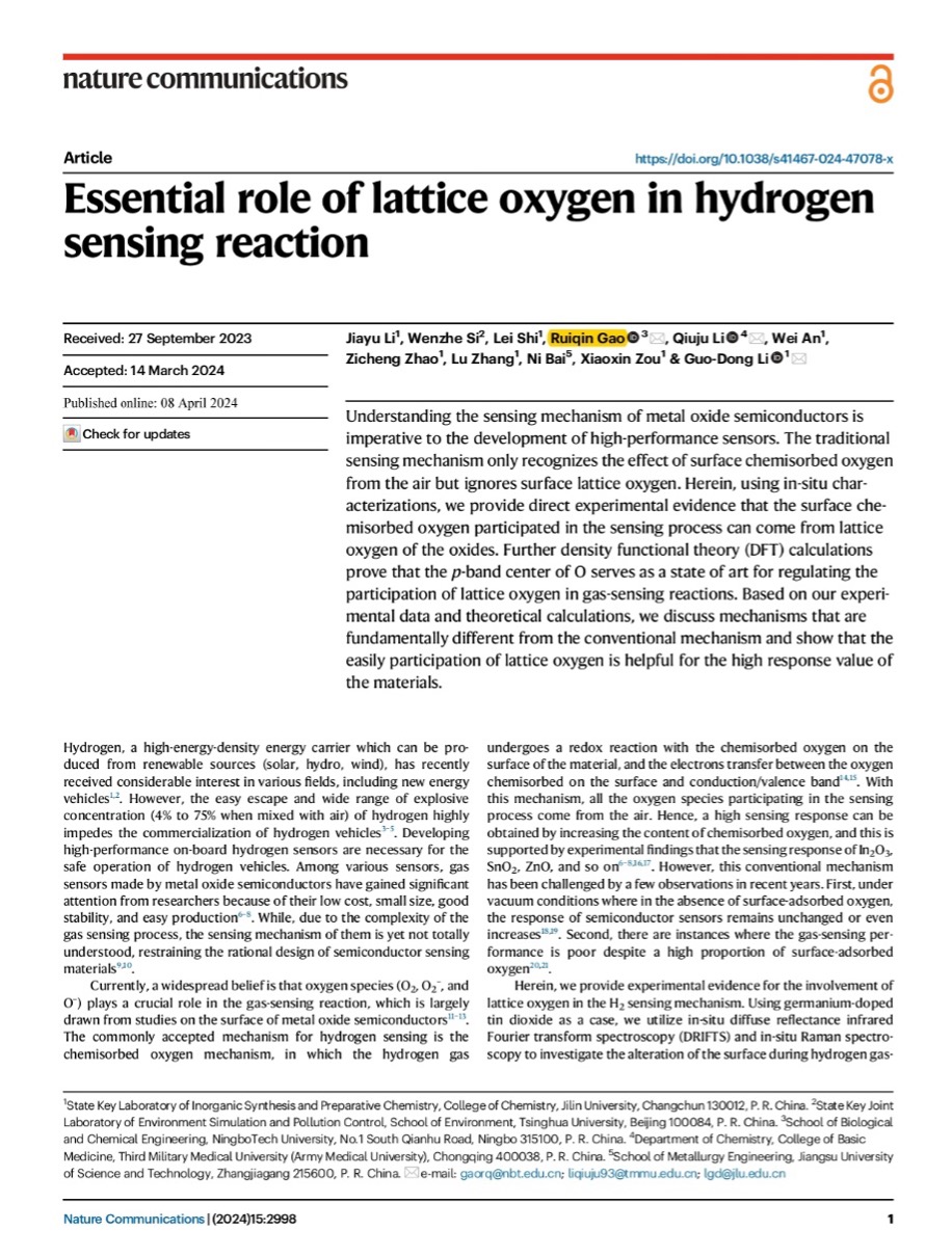 近日,生化学院高瑞芹博士在金属氧化物半导体的机理研究方面取得重要进展,相关成果“Essential role of lattice oxygen in hydrogen sensing reaction”以通讯作者身份在Nature Communications发表(DOI:10.1038/s41467-024-47078-x)。