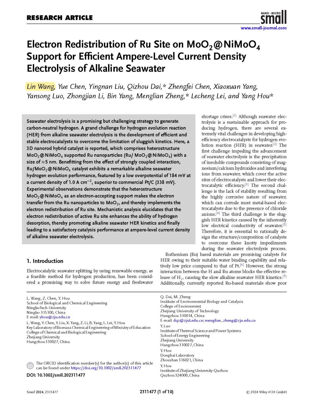 近日,生化学院王淋博士在三维钌基异质结电催化剂的可控设计及电催化海水分解制氢的研究中取得重要进展,相关成果“Electron Redistribution of Ru Site on MoO2@NiMoO4Support for Efficient Ampere-Level Current Density Electrolysis of Alkaline Seawater”以第一作者在Small发表(https://doi.org/10.1002/smll.202311477)。