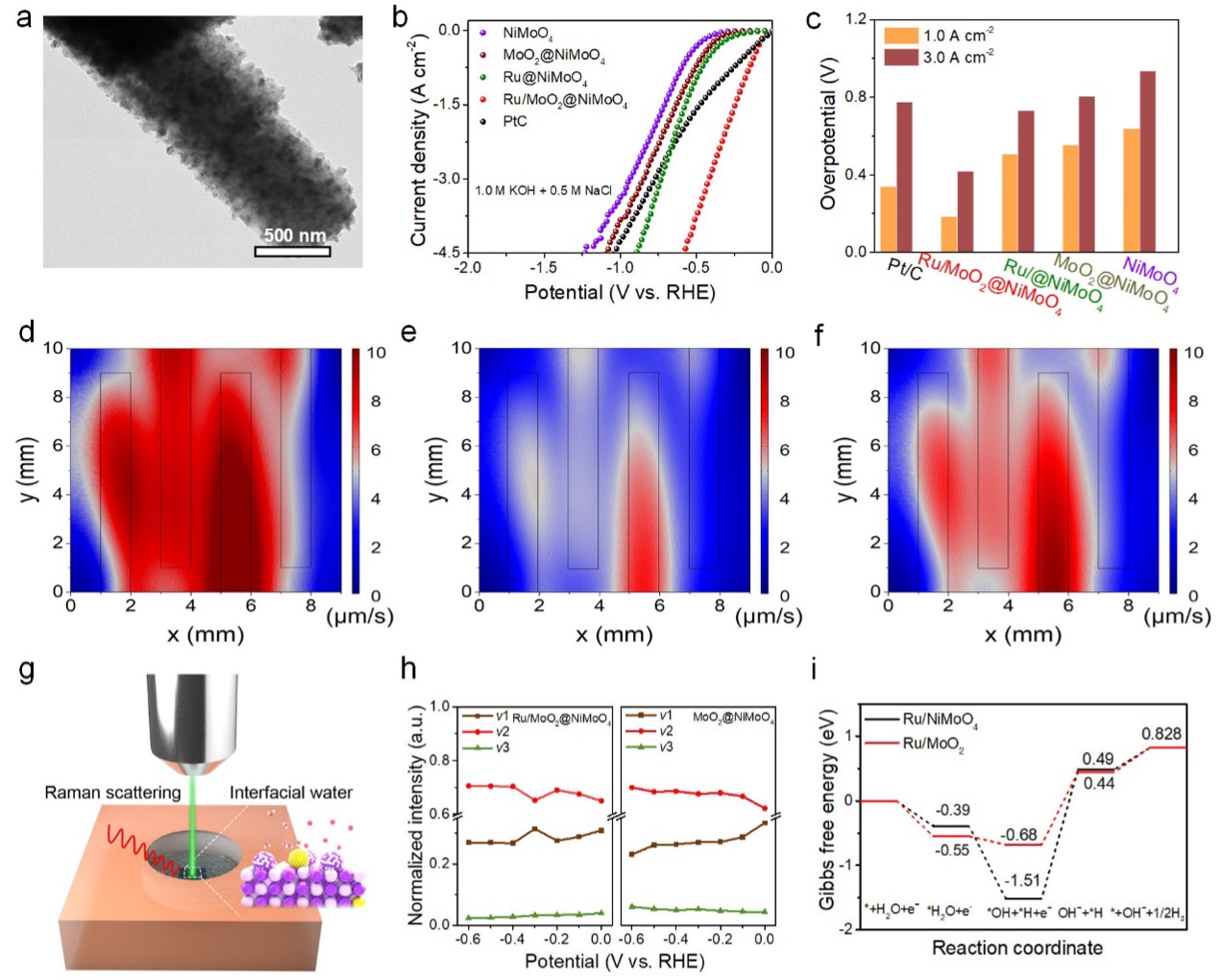 该工作中作者开发了一种钌纳米颗粒镶嵌在NiMoO4/MoO2纳米棒阵列异质结构表面(Ru/MoO2@NiMoO4)的新型电催化剂。获利于活性Ru纳米颗粒与MoO2@NiMoO4异质结电子受体相结合的结构稳定优势,Ru/MoO2@NiMoO4催化剂在1.0 A cm-2的安培级电流密度下表现出卓越的电解海水析氢性能,其过电势仅为184 mV,远低于商业Pt/C催化剂。利用多物理场仿真模拟技术分析催化剂表面亲水性变化对于反应器内部氢气浓度分布的作用规律,研究结果表明:基于强亲水性的Ru/MoO2@NiMoO4异质结电催化剂的反应器中氢气浓度比基于弱亲水性的MoO2@NiMoO4催化剂的反应器中氢气浓度高出近18%。原位电化学红外光谱和理论计算结果也验证了,Ru/MoO2@NiMoO4异质结电催化剂中缺电子态的Ru活性位点有利于水解离并能够提供较低的氢脱附能量势垒,从而优化了电解海水析氢反应动力学,导致了电解海水性能的大幅提升。该研究工作不仅有利于加深对电解海水析氢反应动力学的理解,还提供了一种如何调控多界面金属基催化剂内在活性和结构稳定性的研究思路。