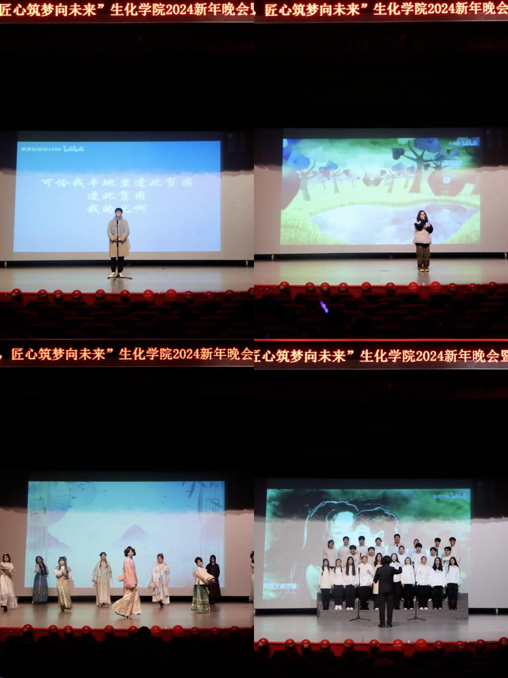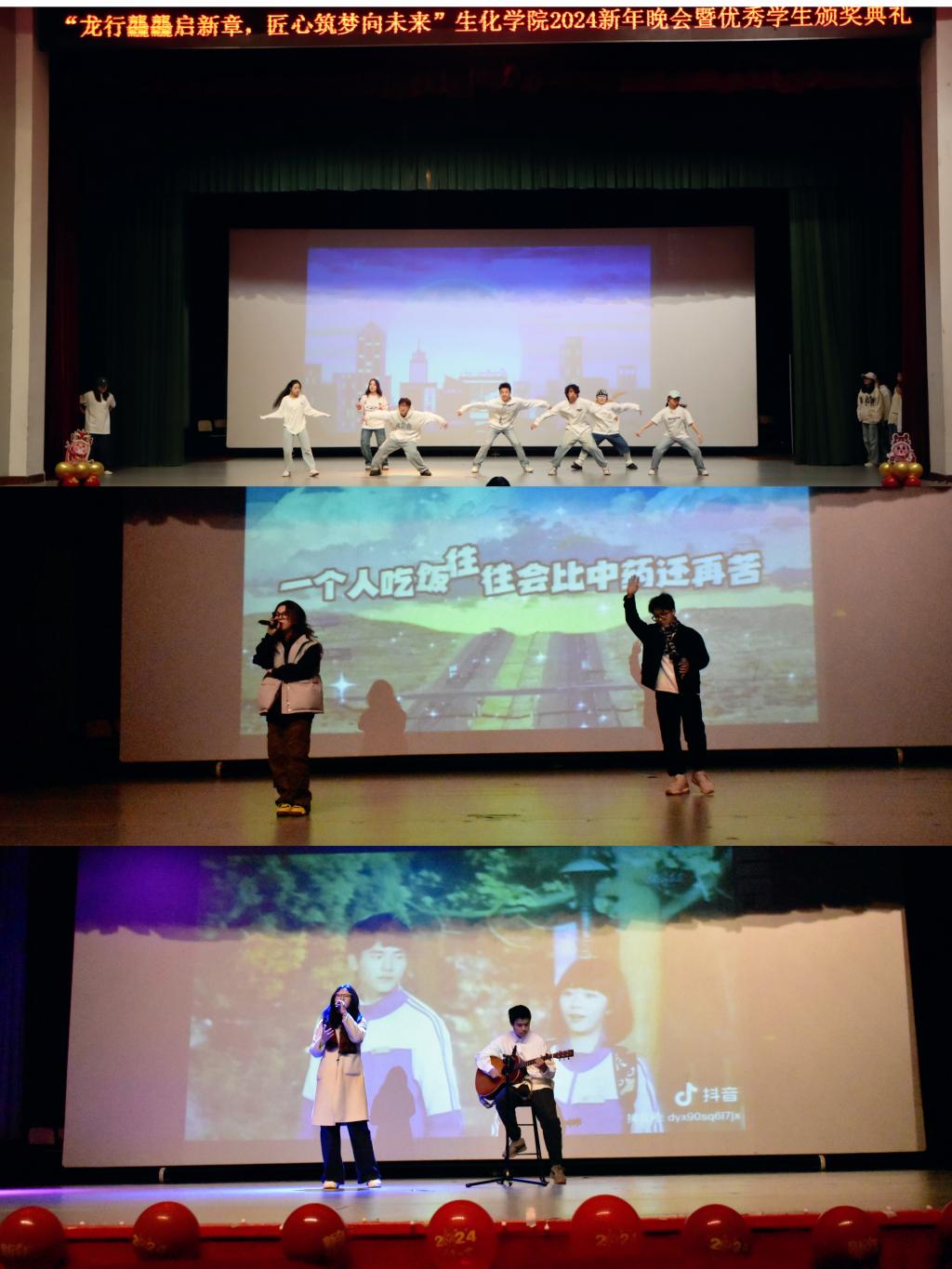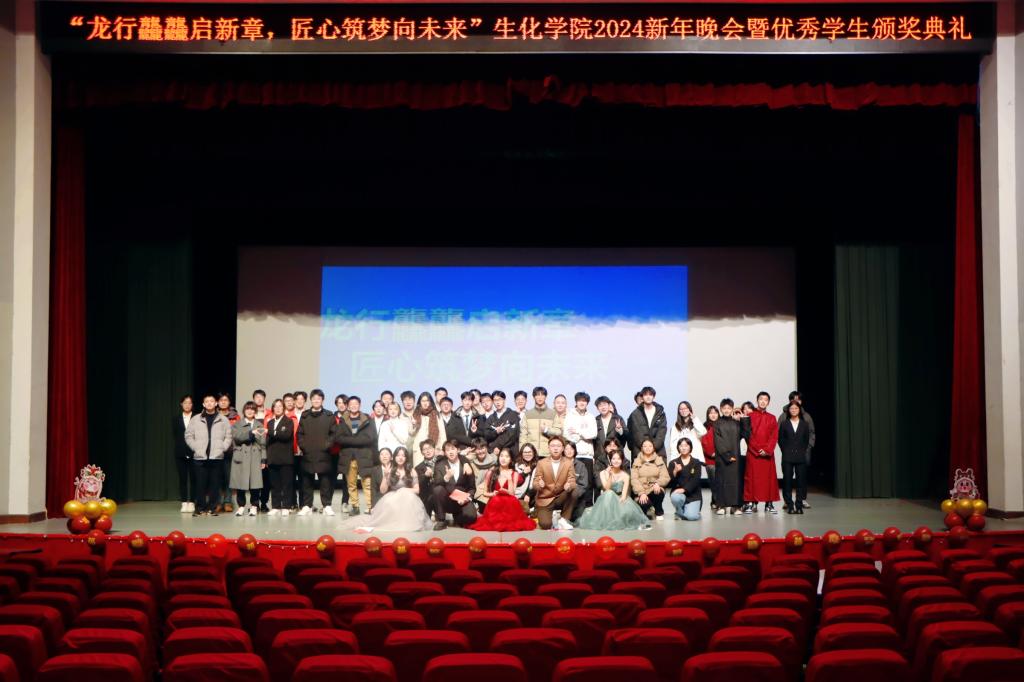 冬至阳生,岁回律转。2024年1月3日,生化学院在可珍讲堂成功举办了主题为“龙行龘龘启新章,匠心筑梦向未来”新年晚会暨优秀学生颁奖典礼。此次活动旨在表彰优秀学生,同时为全院师生献上一场精彩的文化盛宴。学院党委书记刘哲,学院党委副书记、纪委书记王常青,学工办全体辅导员出席了本次活动。