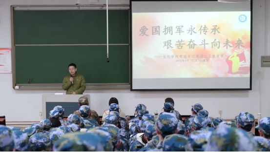为让“爱国拥军”思想常驻学员之心,3月1日,生化学院党委书记刘哲对正在军训的生化学院第十六连全体参训学员开展“爱国拥军永传承,艰苦奋斗向未来”的爱国主义教育。生化学院党委副书记、纪委书记王常青、学工办主管闫雪茹共同参加此次活动。