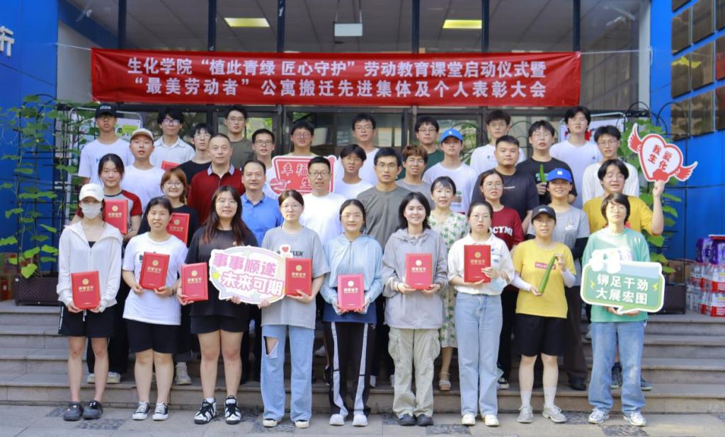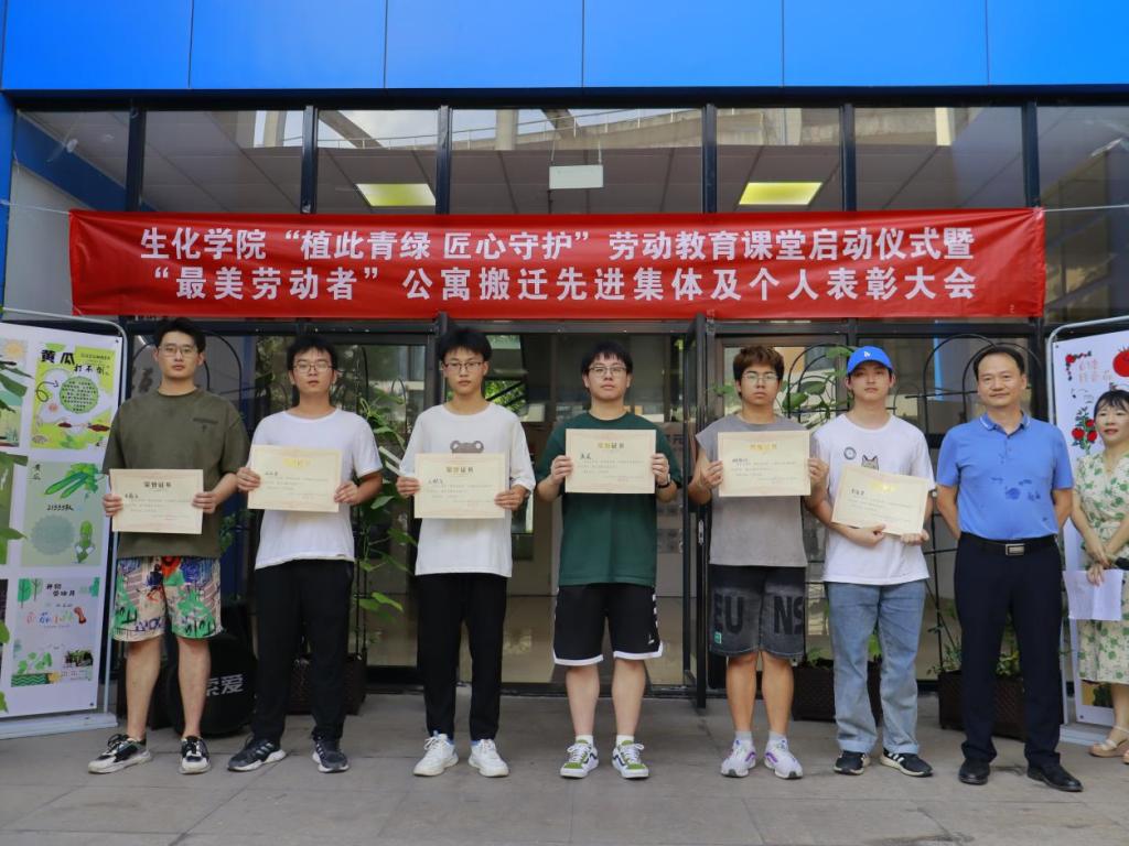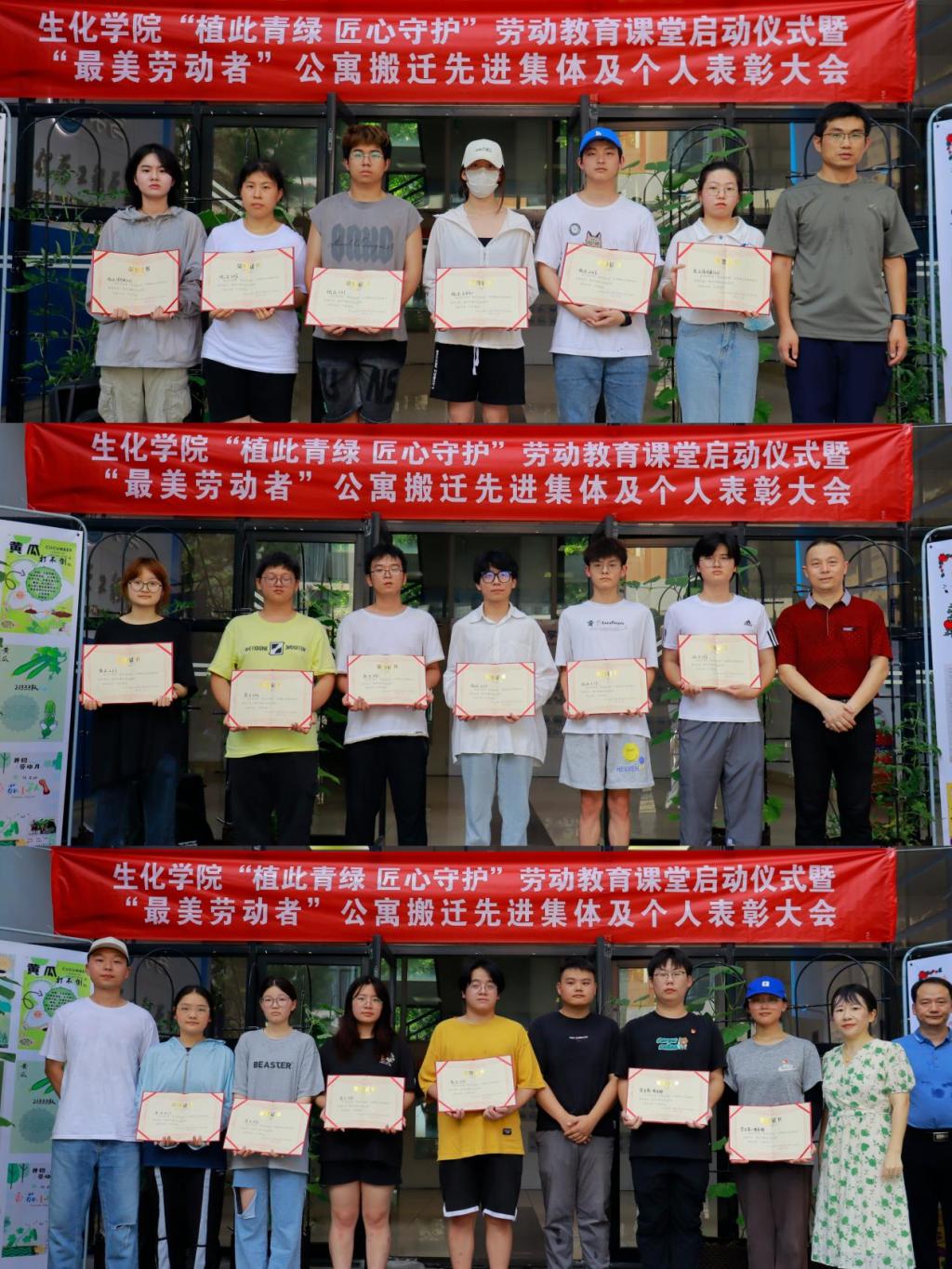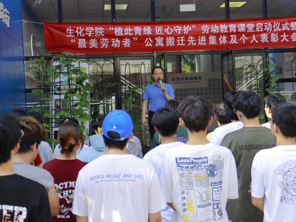 7月8日下午16时许,生化学院举办“植此青绿 匠心守护”劳动教育课堂启动仪式暨“最美劳动者”公寓搬迁先进集体及个人表彰大会。大会在生化学院大门口举行,校团委书记周春晓,校学工部副部长赵涵,学院党委委员武玉学,学工办全体辅导员以及受邀学生代表参加此次活动。大会由学院党委副书记、纪委书记王常青主持。