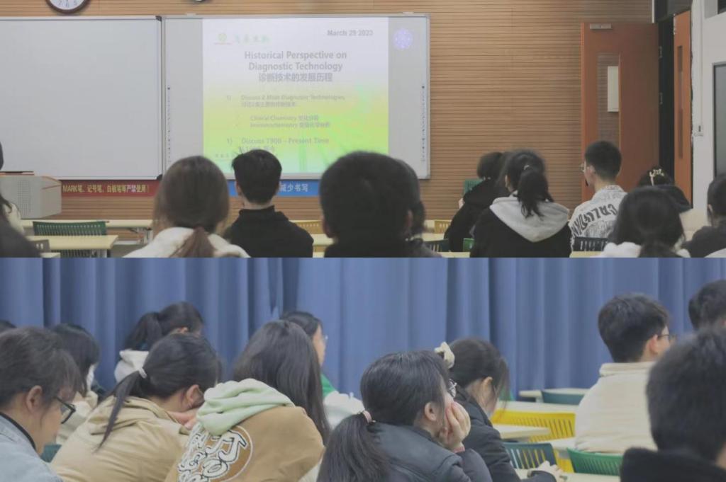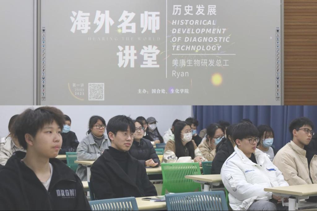 2023年3月29日晚,国合处、生化学院在NB114举办了“海外名师讲堂”第一讲暨“匠心论坛”活动,由美康生物研发总工Ryan主讲诊断技术发展历程(HistoricalPerspective on Diagnostic Technology)。活动由国合处副处长程萌主持。美康生物王芬博士也来到现场与同学们交流。
