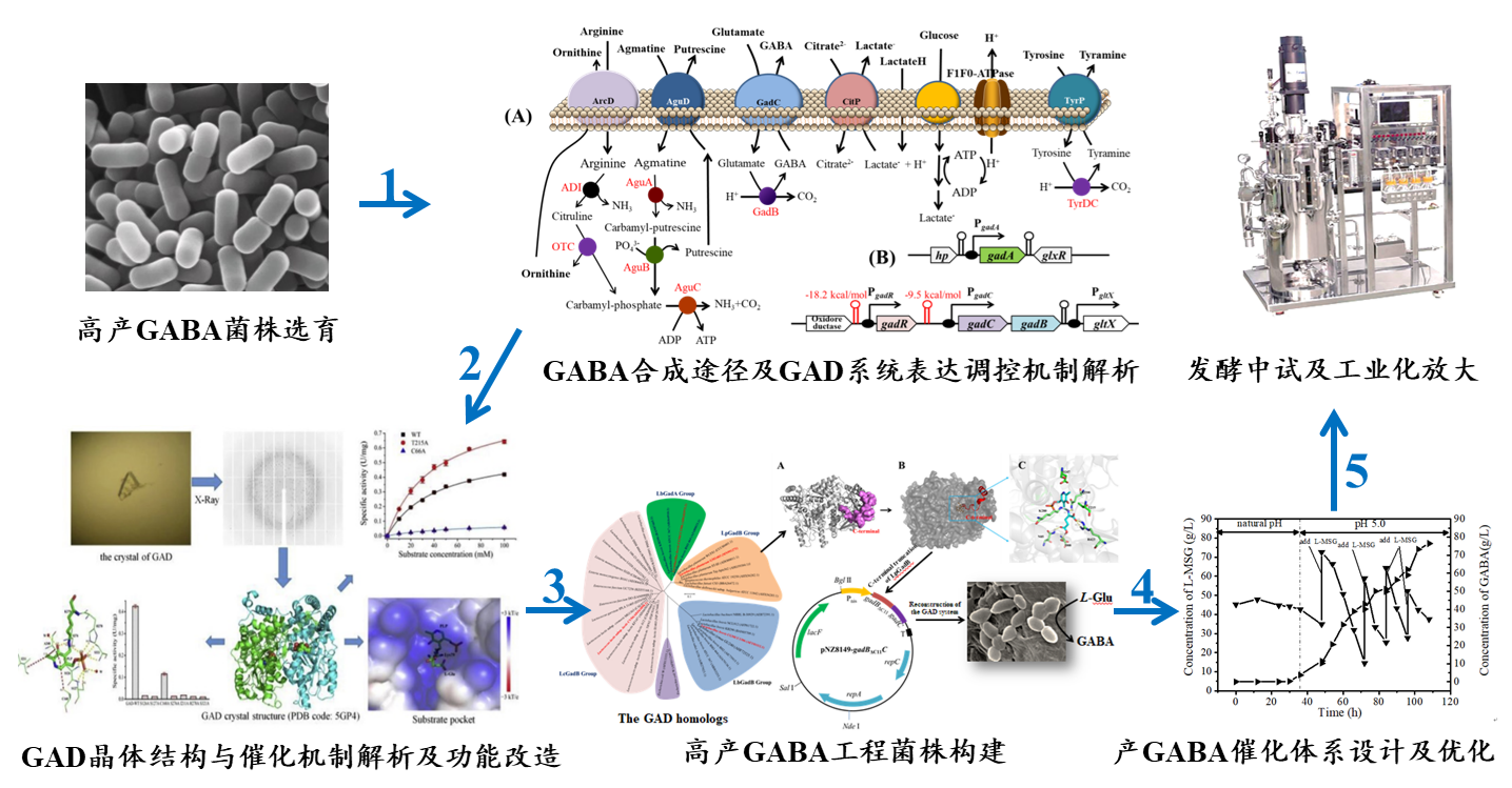 该项目由浙江科技学院、浙江大学、浙大宁波理工学院、山东阳成生物科技有限公司与浙江汇能生物股份有限公司共同完成。项目组基于具有自主知识产权的短乳杆菌菌株,以高效合成γ-氨基丁酸(GABA)为研究目标,阐明了短乳杆菌谷氨酸脱羧酶(GAD)系统中关键蛋白的转录调控机制及其在细胞抵御环境酸胁迫、GABA合成过程中的具体作用,揭示了GAD操纵子中各相关基因的功能及基因间的相互作用机制;解析了乳酸菌GAD的晶体三维结构,在分子水平阐明了GAD的催化机制;提出了pH调控GAD催化活性的机理假说,发展了整合易错PCR、位点饱和突变、动态二硫键挖掘、折叠自由能预测、温度因子设计、蛋白表面电荷优化等方法的GAD定向进化技术,综合应用蛋白质工程、代谢工程、合成生物学及发酵过程优化等手段创制了多个具有高效合成GABA能力的工程菌株及工程酶,建立了GABA生物催化、提取加工生产示范线4条,开发GABA饲料添加剂新产品3个,不仅使得GABA的发酵水平及生产效率超过了国外发达国家水平,而且还取得了显著的经济和社会效益。