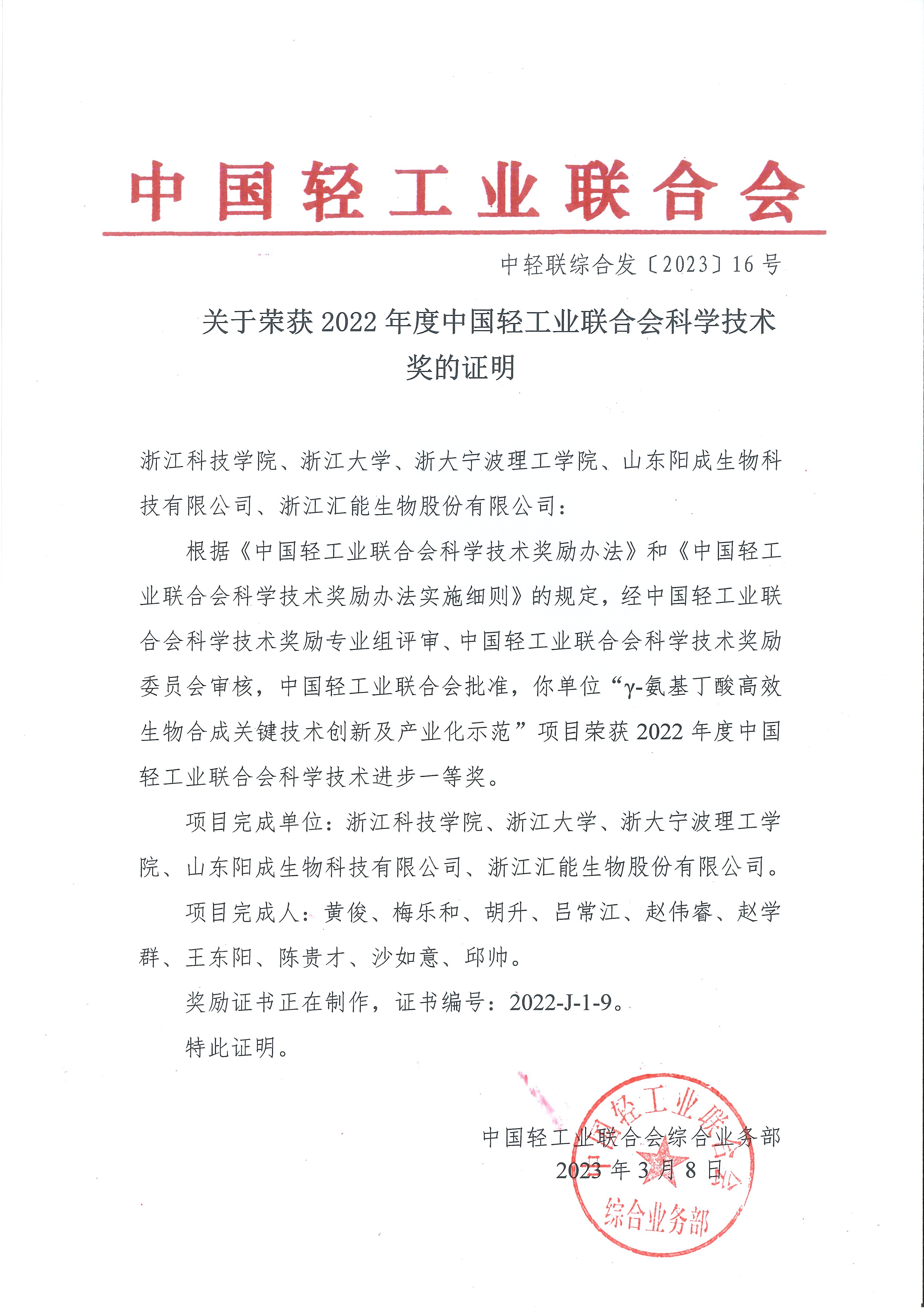 2022年度中国轻工业联合会科技进步奖获奖成果近日揭晓,我院梅乐和教授、胡升副教授和赵伟睿博士作为主要完成人参与的“γ-氨基丁酸高效生物合成关键技术创新及产业化示范”项目喜获科技进步一等奖。