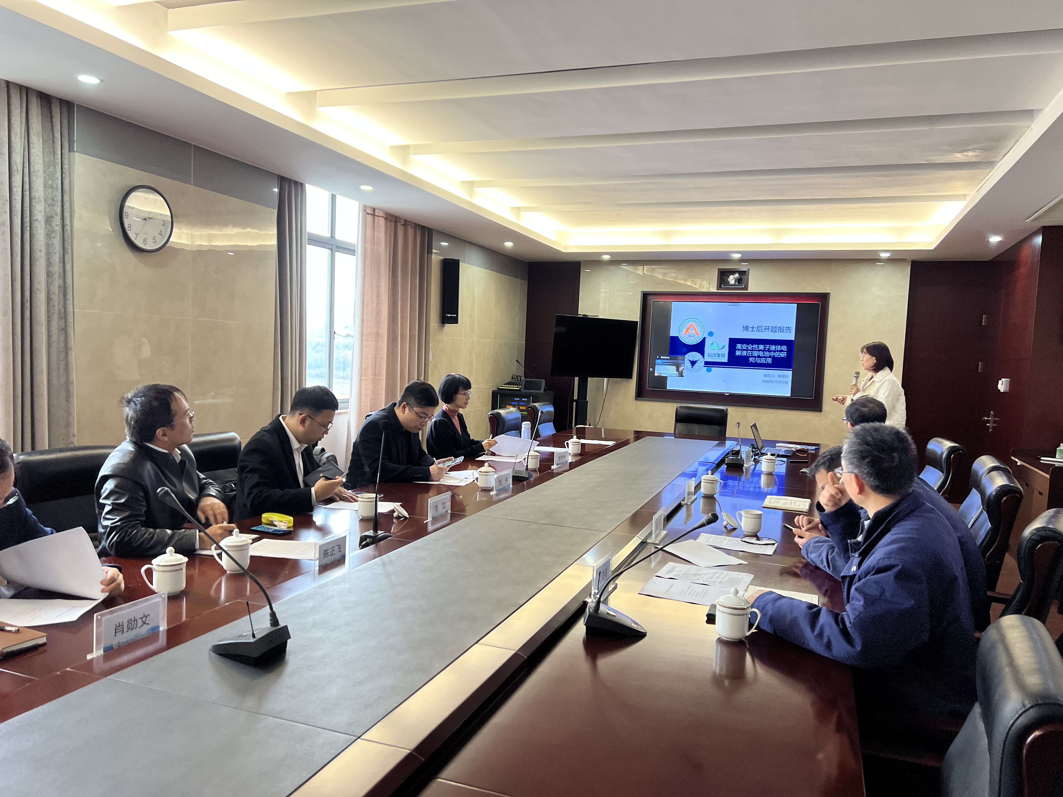 报告会上,郑亚云博士以“高安全性离子液体电解质的研究与应用”为题目作了开题报告,该课题结合镇洋发展股份有限公司的发展战略需求,聚焦高安全性的离子液体电解质在储能、电化学方面的应用,对于开发新一代电解质材料具有重要意义。与会专家对郑亚云的博士后研究方向及内容提出了指导性建议,公司领导也对郑博士的博士后工作方案和规划予以了肯定,一致同意通过开题。