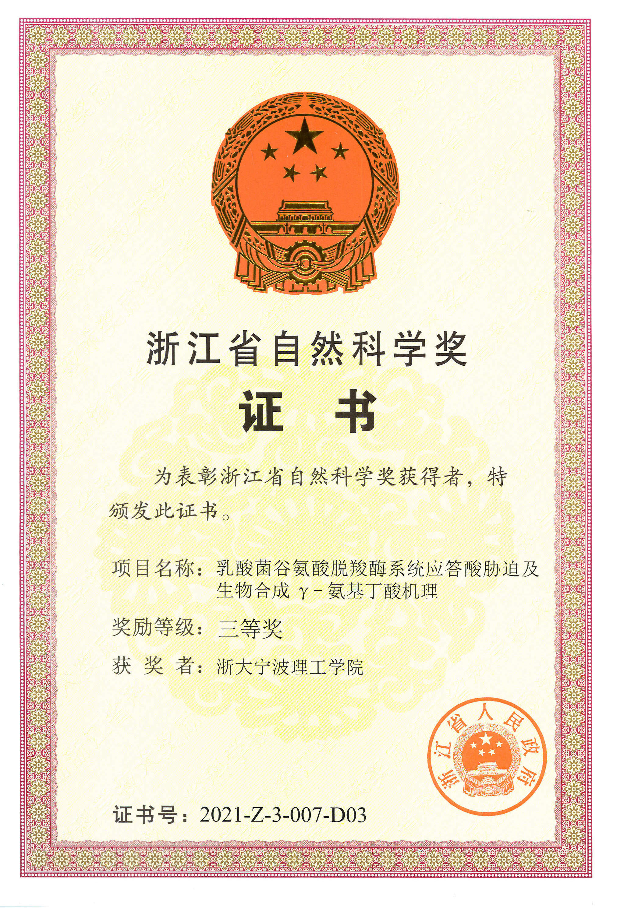 7月11日,浙江省科技创新大会在浙江省人民大会堂举行。我院梅乐和、胡升、赵伟睿参与完成的“乳酸菌谷氨酸脱羧酶系统应答酸胁迫及生物合成γ-氨基丁酸机理”成果获浙江省自然科学奖三等奖。