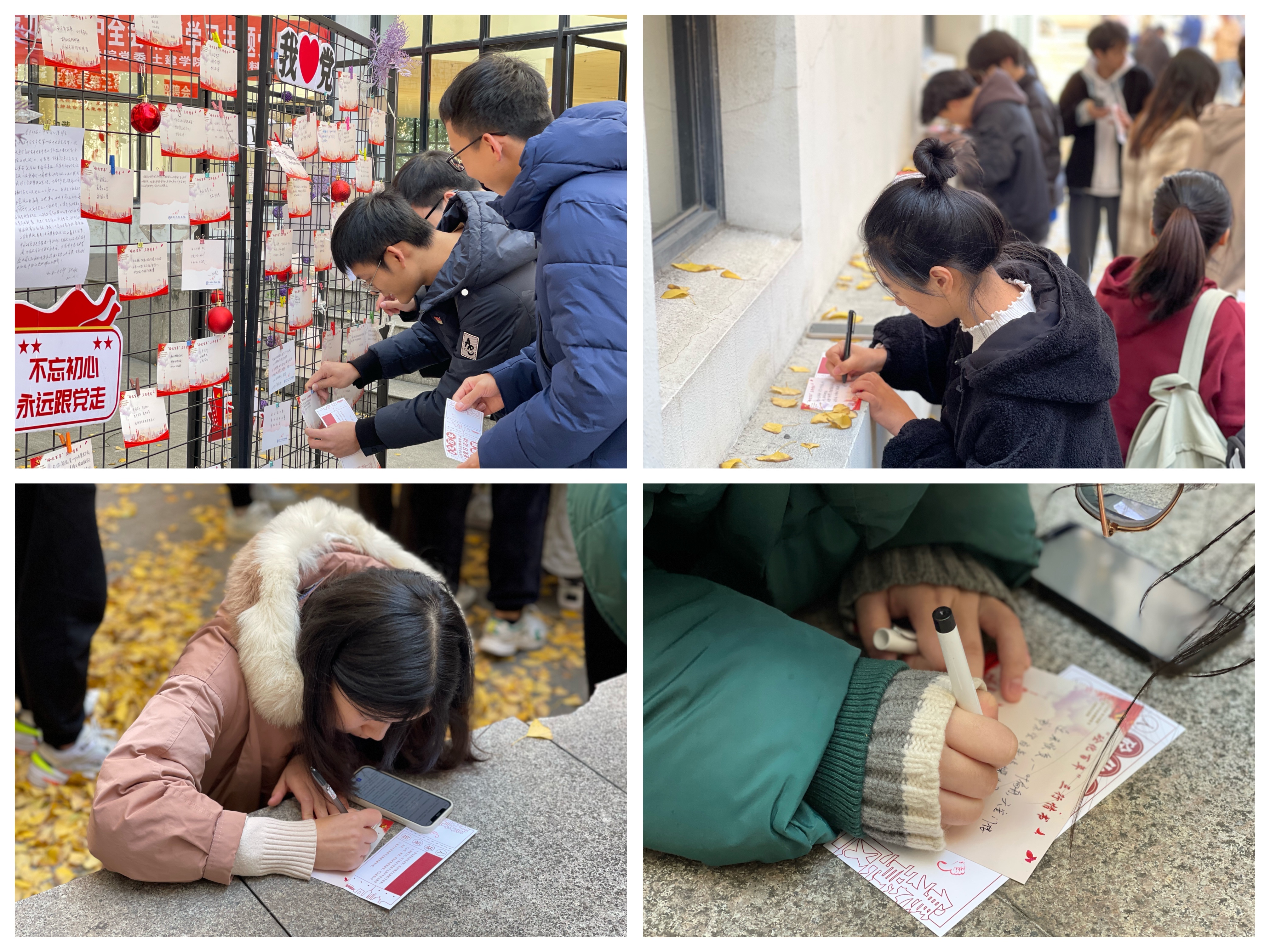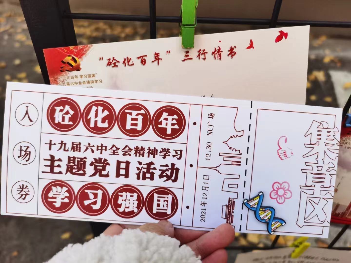 中午时分,学生党员们结伴而来,活动现场立马充满了生机,本次主题党日活动是积分闯关,大家累计答对5道题目可以获得一枚印章,进入下一关,写下给党的三行情书或十九届六中全会的学习心得便可获得第二枚印章,将写满祝福的明信片挂在心愿墙即完成本次闯关任务,可兑换到一枚精美的“新青年”勋章。随着活动的进行,参与的党员越来越多,现场热烈的氛围也吸引来往的师生驻足停留,参与其中,互相交流着答题心得,欣赏着同学们写下的祝福,一个小时的活动让很多师生意犹未尽。