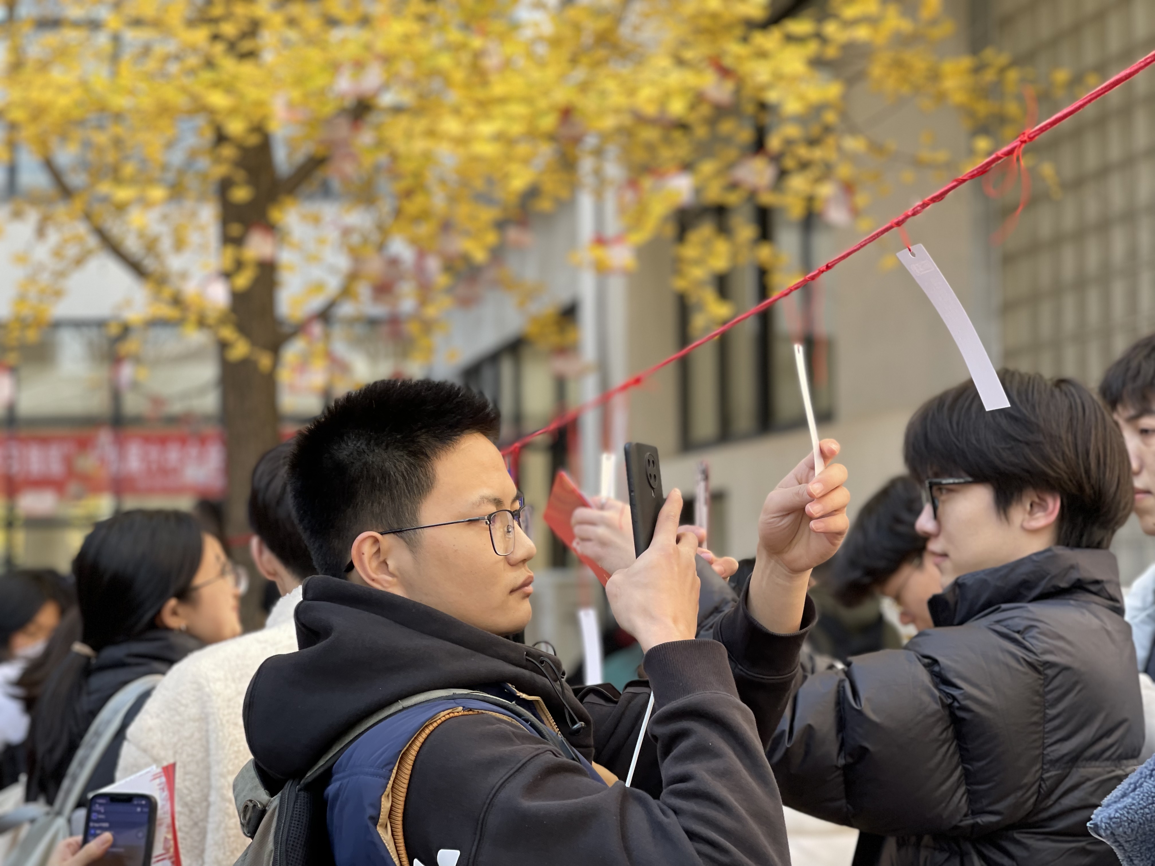 党员们手握入场券,走进了为党营造的童话世界,满园的银杏树在正午暖阳的照耀下闪着金光,微风吹过,便随风舞了起来,走进一看,树上系满了同学们写给党的三行情书,红色的卡片、红色的丝带点缀着银杏,像是结出了满树热烈的红果,树木间由一条红绳连接,挂满了一道道党史和十九届六中全会相关的题目,另一侧则竖立了党历届党的全国代表大会图文介绍,满目望去,一片红黄海洋。