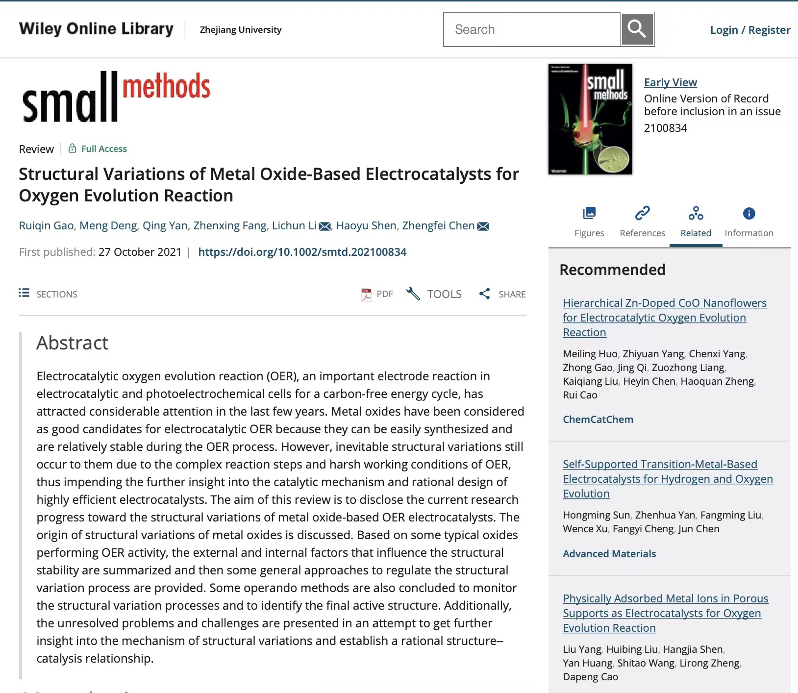 近日,生化学院陈正飞教授团队在国际知名期刊Small Methods(影响因子14.188)上发表题为“Structural Variations of Metal Oxides-Based Electrocatalysts for Oxygen Evolution Reaction”综述文章(https://doi.org/10.1002/smtd.202100834),对金属氧化物催化剂在电催化析氧反应(OER)中的结构转变进行了全面综述。论文第一作者为团队成员高瑞芹,共同作者包括邓萌、闫卿和沈昊宇等。