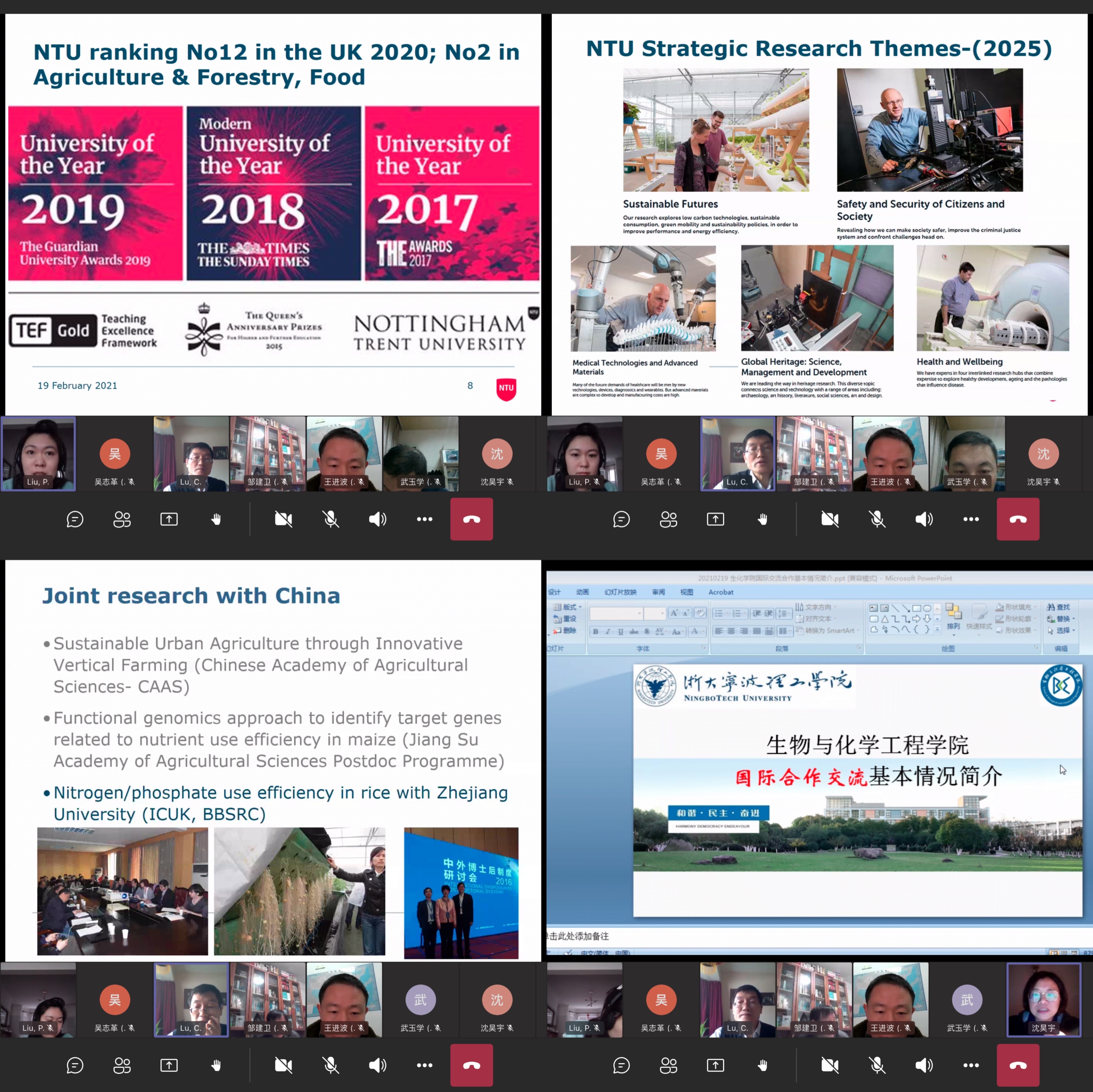 2月19日,生化学院与英国诺丁汉特伦特大学(Nottingham Trent University,简称NTU)举行国际合作视频交流会。NTU动物乡村及环境科学学院国际合作负责人陆春贵教授、国际合作处东亚区域合作事务负责人刘沛女士,生化学院副院长沈昊宇、副院长王进波教授,各研究所负责人及相关专业教师参加本次交流。会议由沈昊宇副院长主持,并邀请了学校国际交流合作处程萌副处长、设计学院张峰副院长参加。