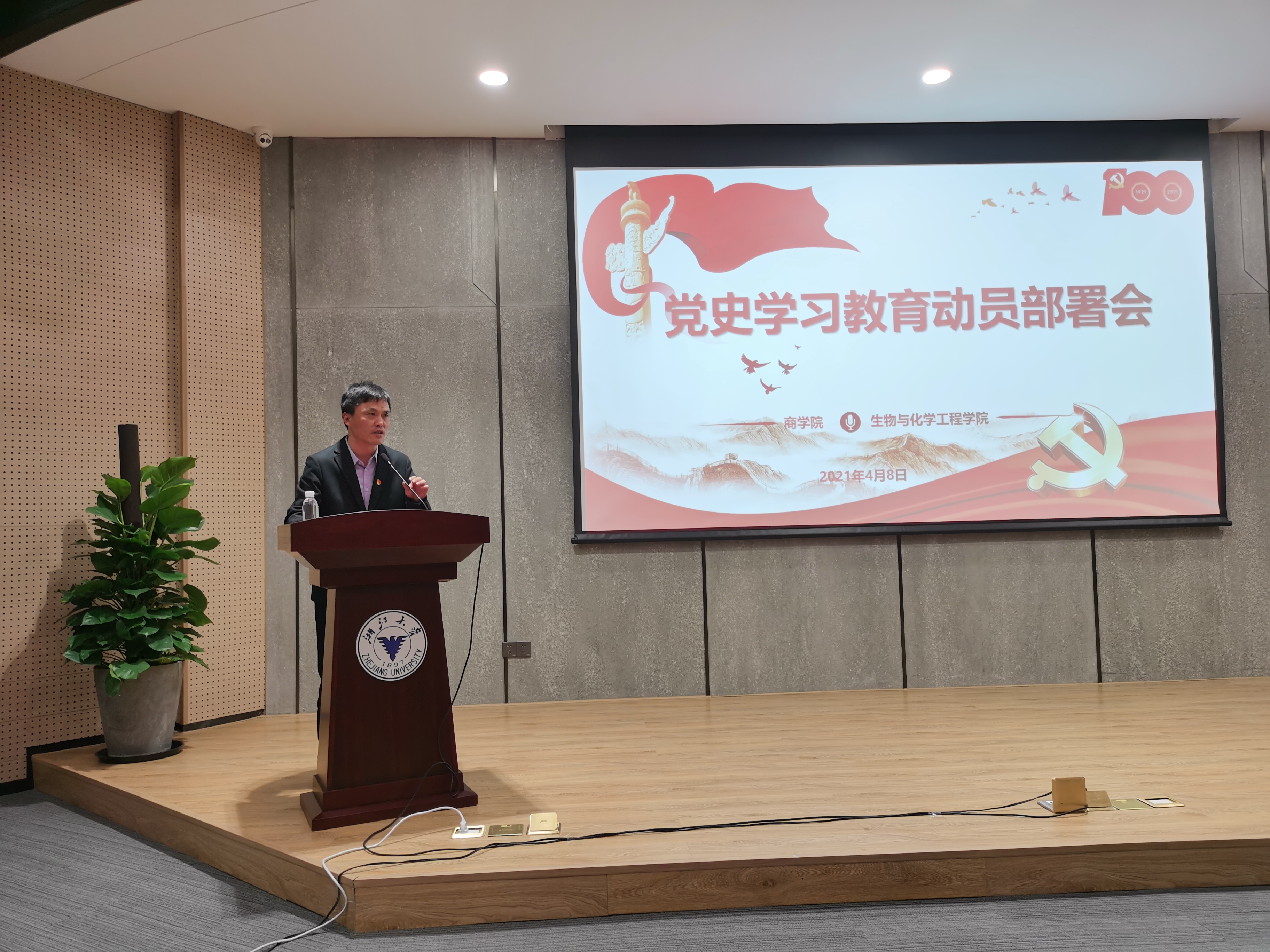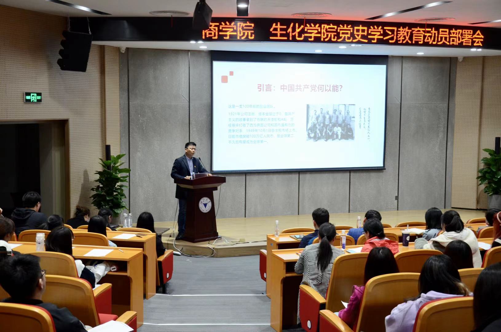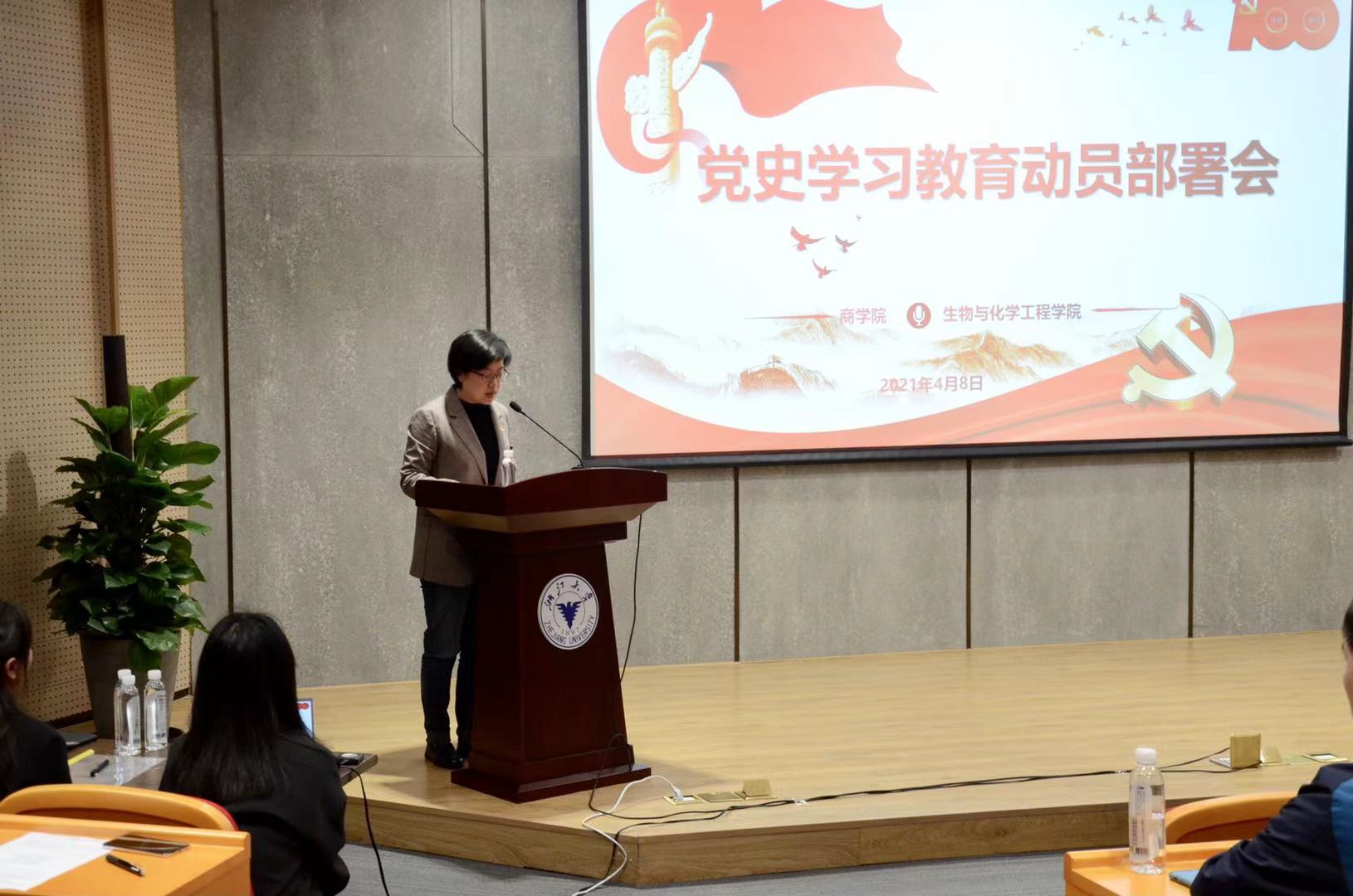 4月8日下午,商学院、生物与化学工程学院在启新大讲堂联合召开党史学习教育动员部署会。商学院党委书记兼副院长李萍萍、党委副书记、纪委书记周丽娟,各党支部委员、第四十期入党积极分子参加动员部署会;生化学院党委副书记(主持工作)兼副院长楼文军,全体学生党员、第14期重点发展对象参加会议。马克思主义学院副教授吴新林受邀做党史学习教育专题党课。楼文军主持动员部署会。
