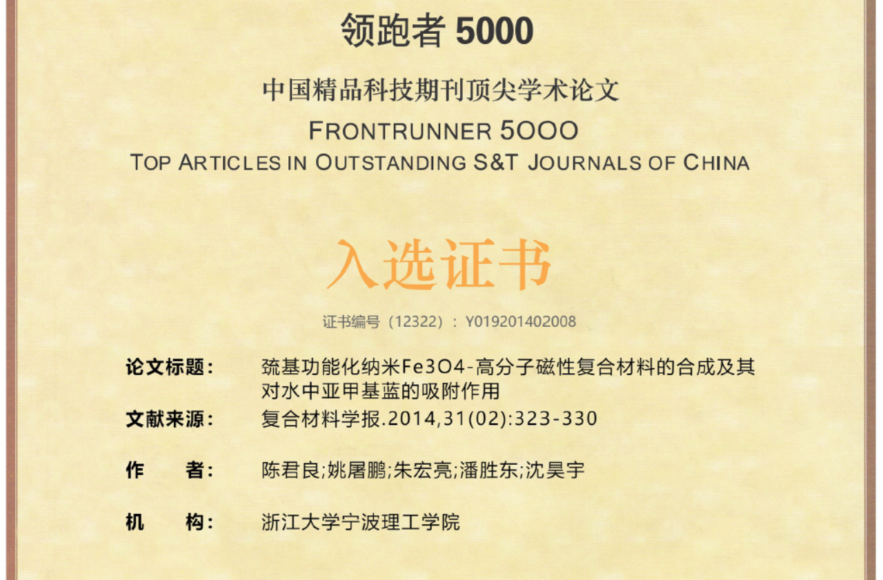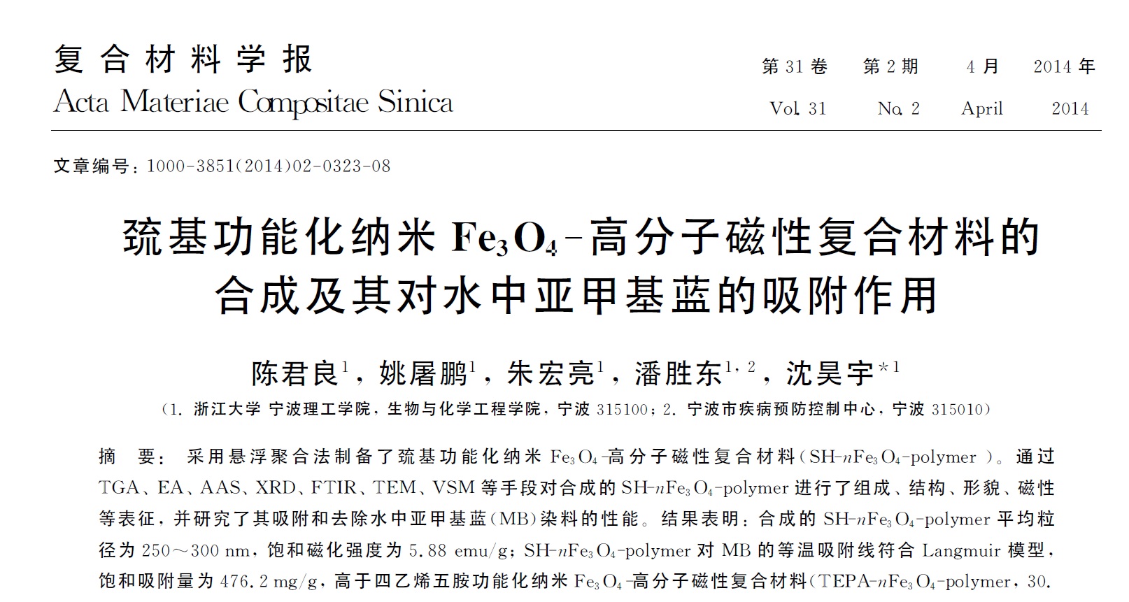 我校化学工程与工艺专业学子陈君良以第一作者发表在《复合材料学报》的论文“巯基功能化纳米Fe3O4高分子磁性复合材料的合成及其对水中亚甲基蓝的吸附作用”日前入选领跑者5000中国精品科技期刊顶尖学术论文。