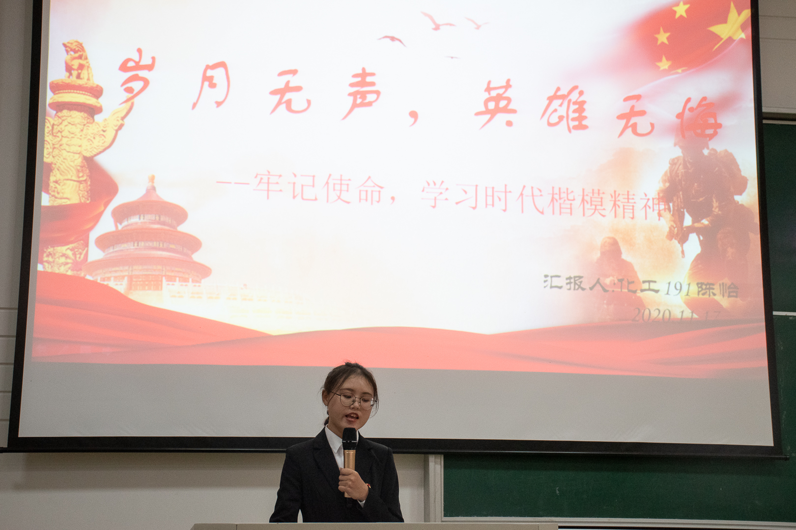 正式比赛首先由学生第一党支部以“牢记使命,学习时代楷模”为主题,化工191的陈怡从“重回1950、时代楷模、精神学习”三个部分介绍了时代楷模孙景坤,英勇善战,不畏牺牲,淡泊名利;化工201的王志鹏以南仁东为时代楷模从伟大斗争、伟大工程、伟大事业,伟大梦想对党的使命进行了解读;制药工程192的牟雪华,以张富清和钟南山为例,宣扬其铭记初心,不竭奋斗时代精神;化工203的蔡雯斐,向观众展现了钟南山甘于奉献、追求卓越、勤耕不辍的精神。