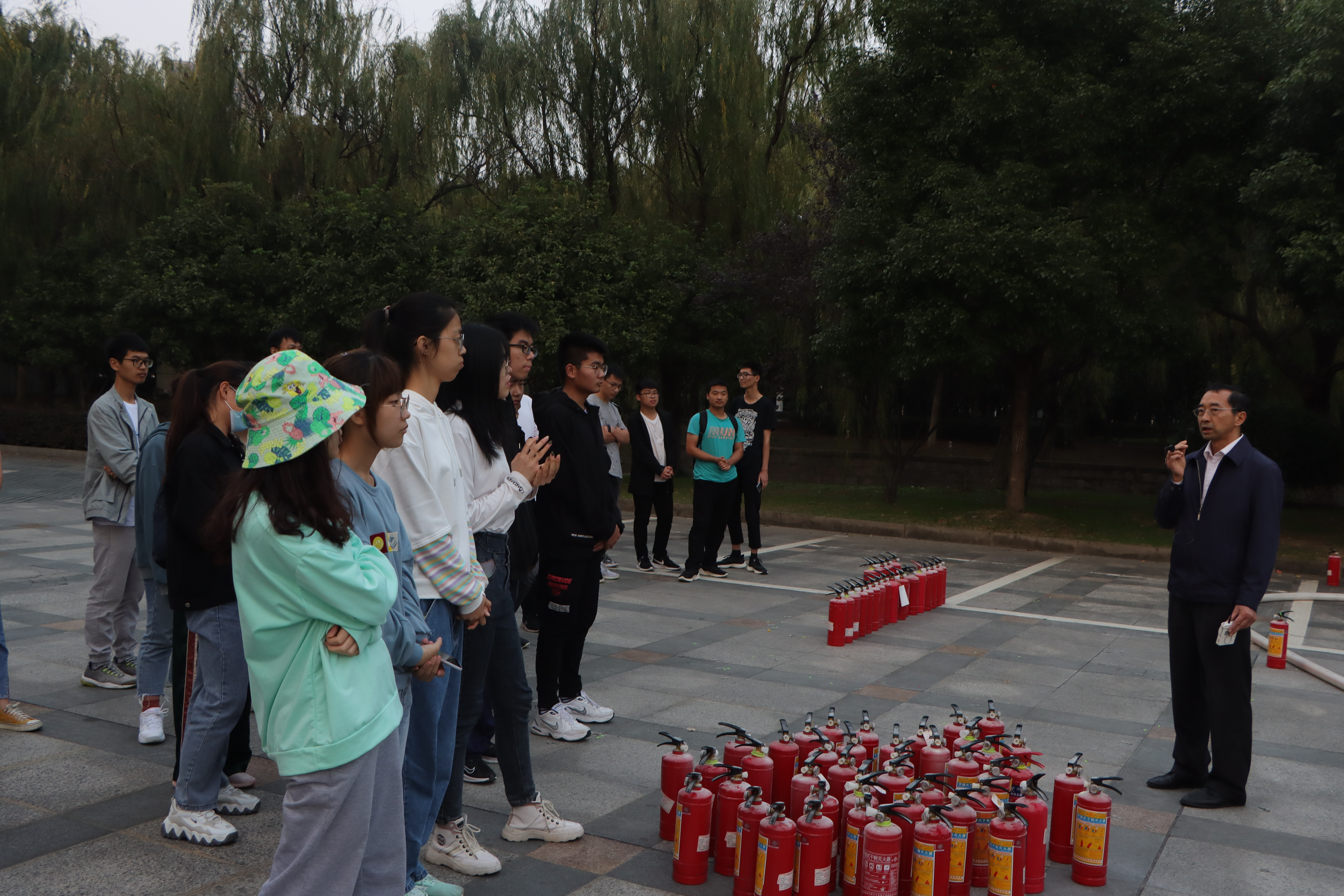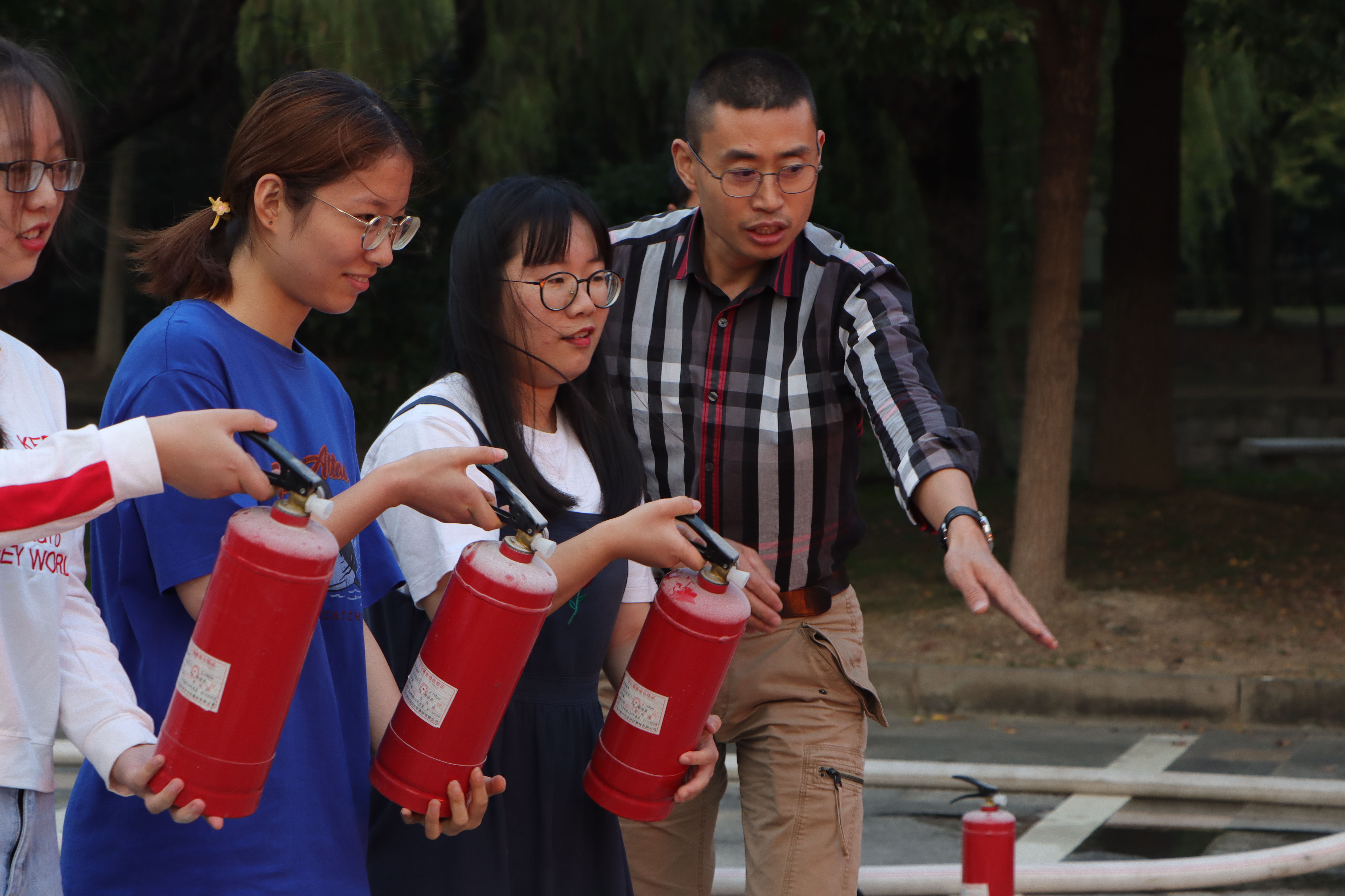 16点10分,演习正式开始。两个学院的师生在消防引导员的哨声指引下,按指定逃生线路从教学楼快速撤离,前往石麟大楼安全点汇合。完成疏散任务后,燕永波老师进行了安全讲座,介绍各类火险应对方式,详细讲解并演示干粉灭火器的使用方式。随后,在燕老师及校卫队员的指导下,师生们轮流操作灭火器进行现场灭火。