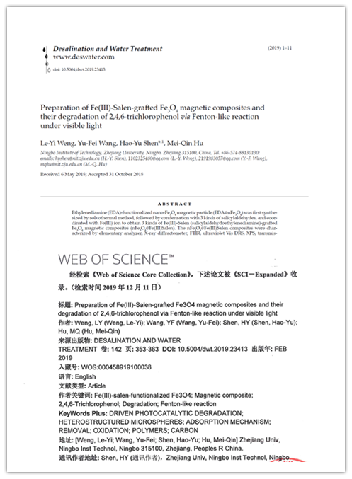 以化学工程与工艺专业2015级本科生翁乐仪为第一作者,我院教师沈昊宇教授为通讯作者的SCI论文“Preparation of Fe(III)-Salen-grafted Fe3O4magnetic composites and their degradation of 2,4,6-trichlorophenol via Fenton-like reaction under visible light”发表在环境科学与生态学领域期刊Desalination and Water Treatment。