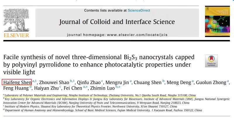 近日,我院本科生发表论文质量再获突破,以第一作者首次发表JCR一区(JCR一区指该学科所有期刊上一年度影响因子排列前25%的期刊)研究论文,高分子材料与工程专业16级本科生沈海峰在胶体与界面科学领域顶级期刊Journal of Colloid and Interface Science(影响因子6.361)上以第一作者发表了题为“Facile synthesis of novel three-dimensional Bi2S3nanocrystals capped by polyvinyl pyrrolidone to enhance photocatalytic properties under visible light”的研究论文,论文的通讯作者为我院教师陈飞副教授,共同作者包括高分子材料与工程专业17级本科生金梦如同学、邓萌副教授和钟国伦教授。