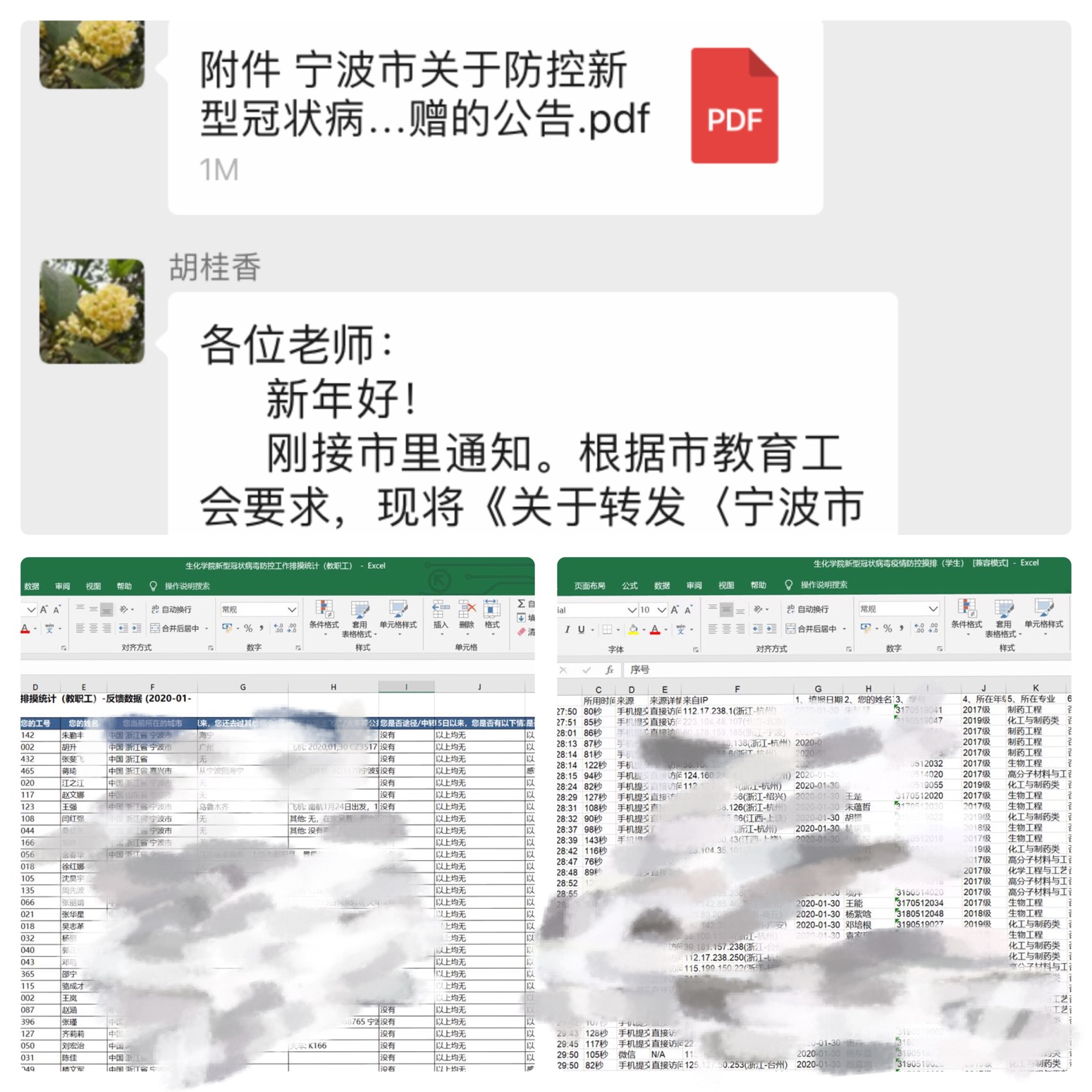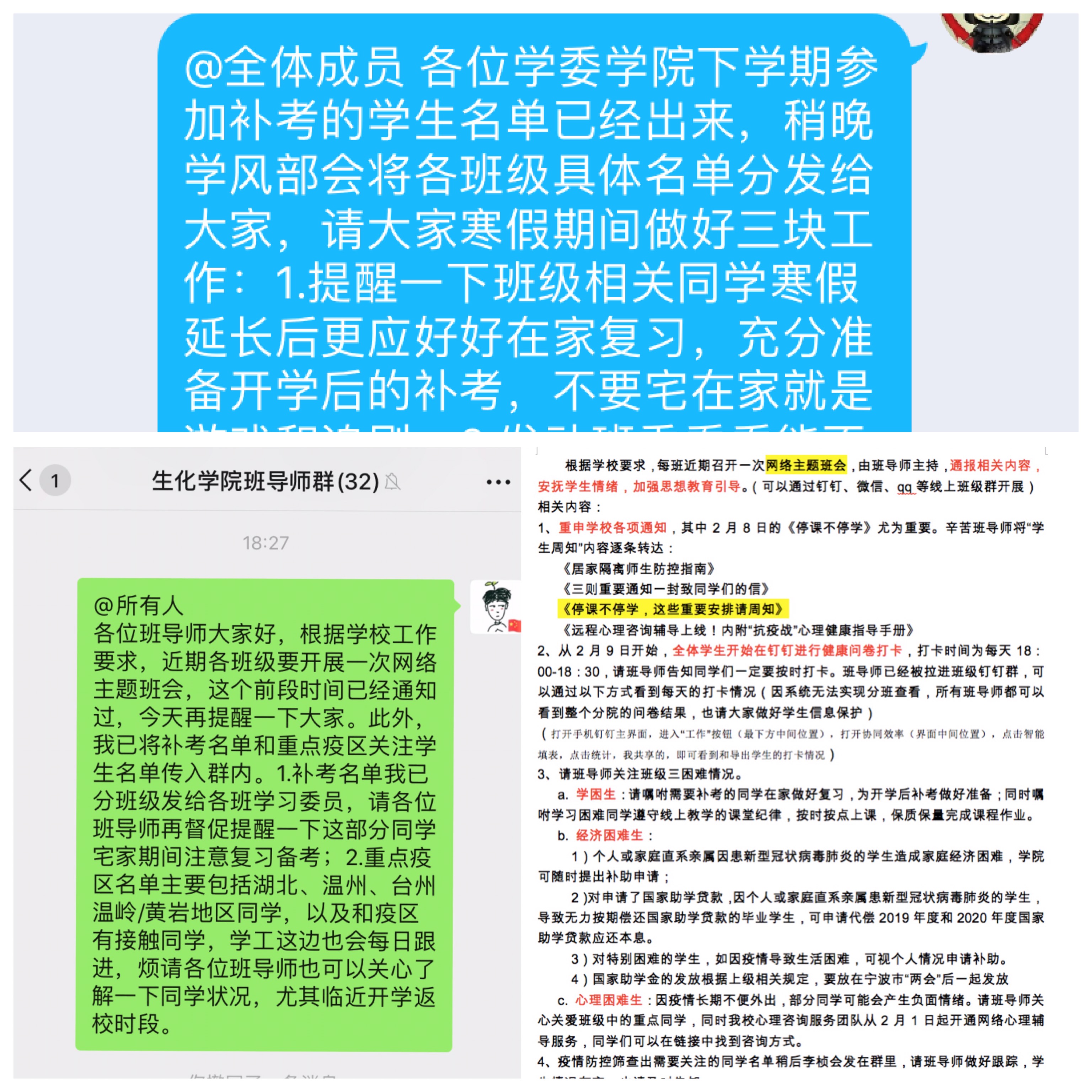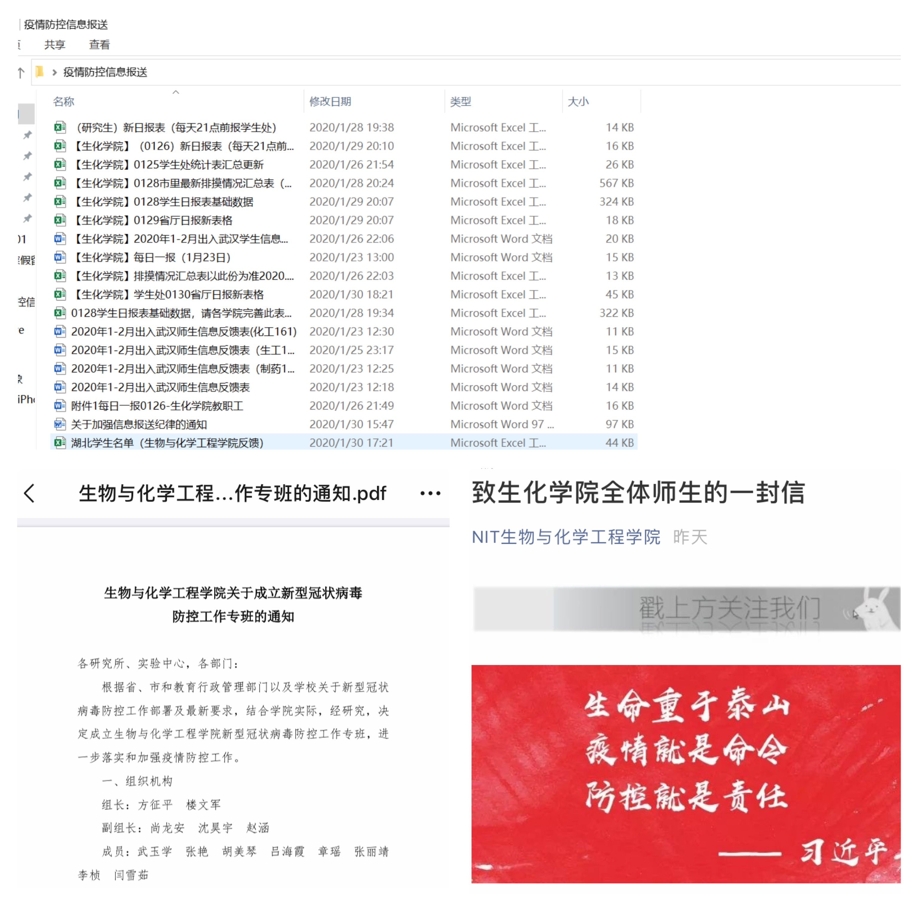 及时反应,压实责任。针对新型肺炎疫情,1月23日上午,学院党政班子紧急召开疫情防控工作部署会,制定多项防疫举措,并落实人员信息每日上报工作。1月29日学院紧急成立新型冠状病毒防控工作专班小组,将疫情防控工作作为重中之重,同时线上成立生化学院疫情防控工作群、疫情防控党员工作群、生化学院防疫志愿者群多渠道开展防疫工作。