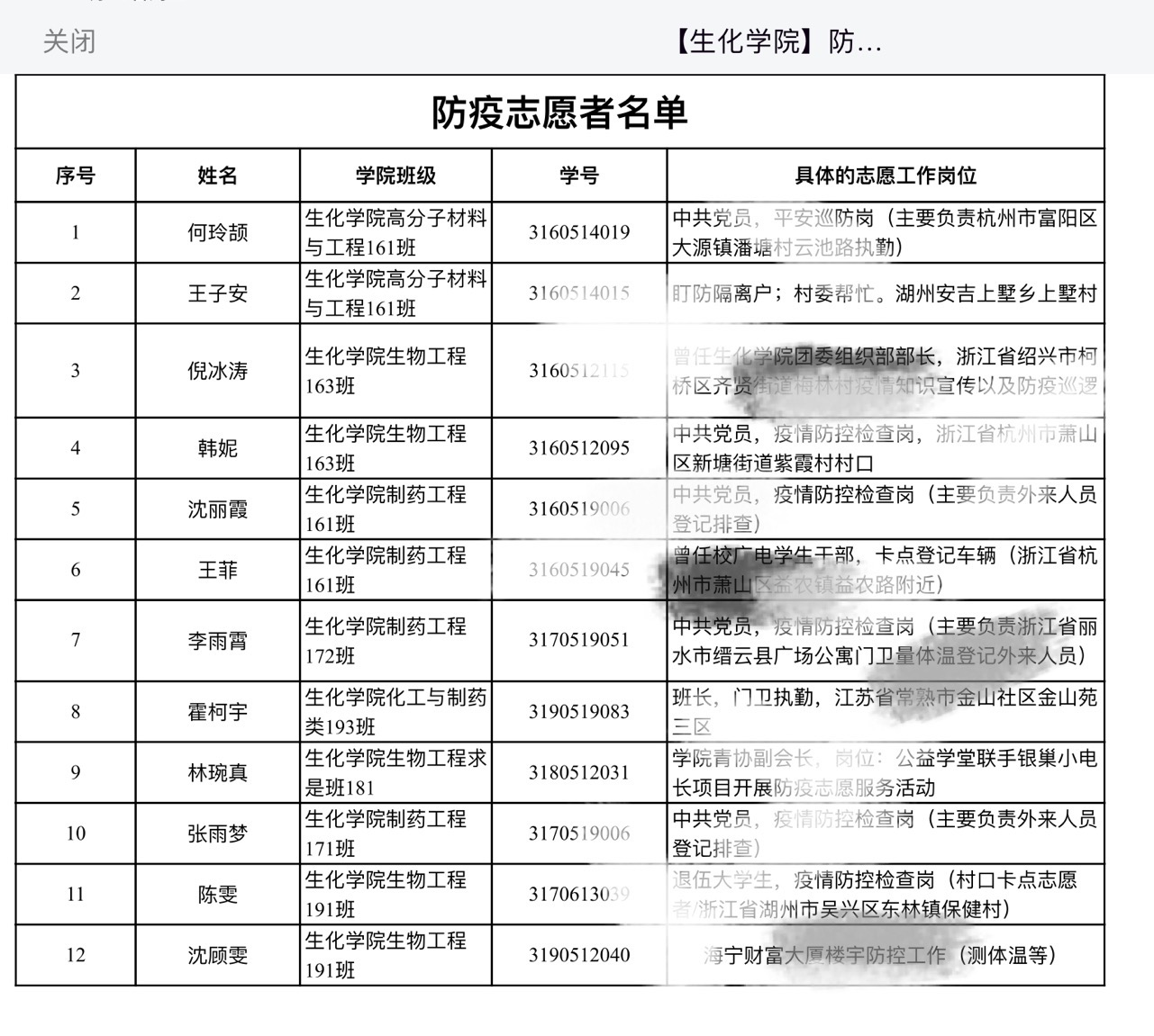 疫情阻挡了生化人团聚的脚步,但是阻挡不了生化人不惧“疫情”险阻,冲锋在前的奉献精神。生化学院有12名同学积极投身基层防控疫情的志愿服务活动,涌现出一批敢于担当、默默奉献的志愿者典型。他们中有退伍不褪色,巾帼不让须眉的退伍大学生陈雯,有结合专业知识进行防疫宣传的倪冰涛,有重点盯防隔离户、受当地媒体点赞的王子安…还有默默投身疫情防护战“疫”,协助张贴标语、参与摸排、定点值守和录入信息的党员团员青年志愿者们,他们在做好个人防护的同时,冲锋在家乡疫情防控一线,为防“疫”宣传、开展志愿服务,积极投身疫情防控阻击战。