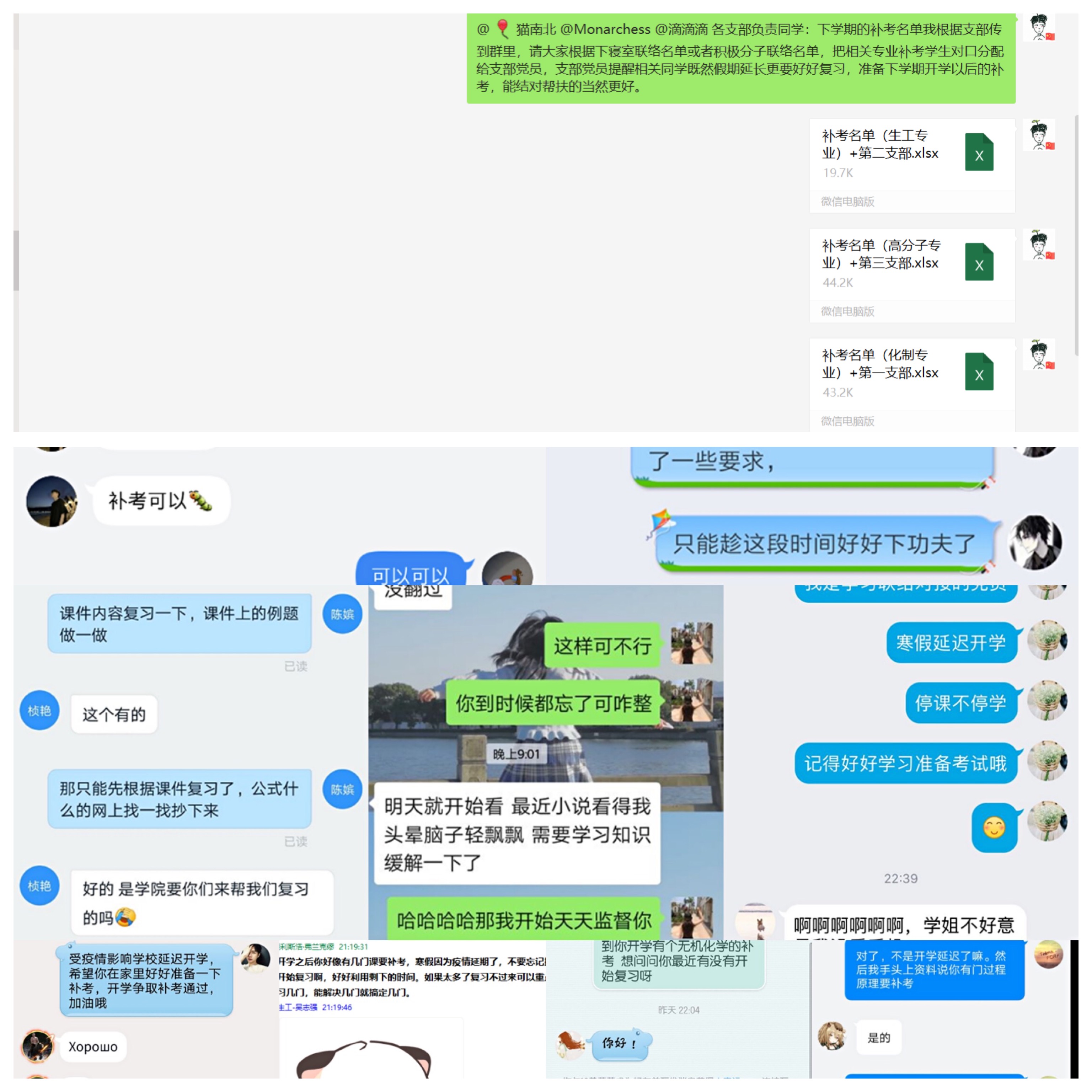 学业帮扶,你我同行。及时传达学校关于补考安排以及线上开课相关通知;将关键信息有重点有针对性地进行对接,了解学生的信息,及时提供帮扶。组织党员、预备党员、积极分子、班干部等帮扶人员。充分发挥党员的先锋模范作用,积极了解帮扶对象的基本情况及学习上存在的主要困难,通过在线解答问题、线下共同学习等方式开展了学习帮扶活动,帮助学生抗疫同时“抗”住学习难关。