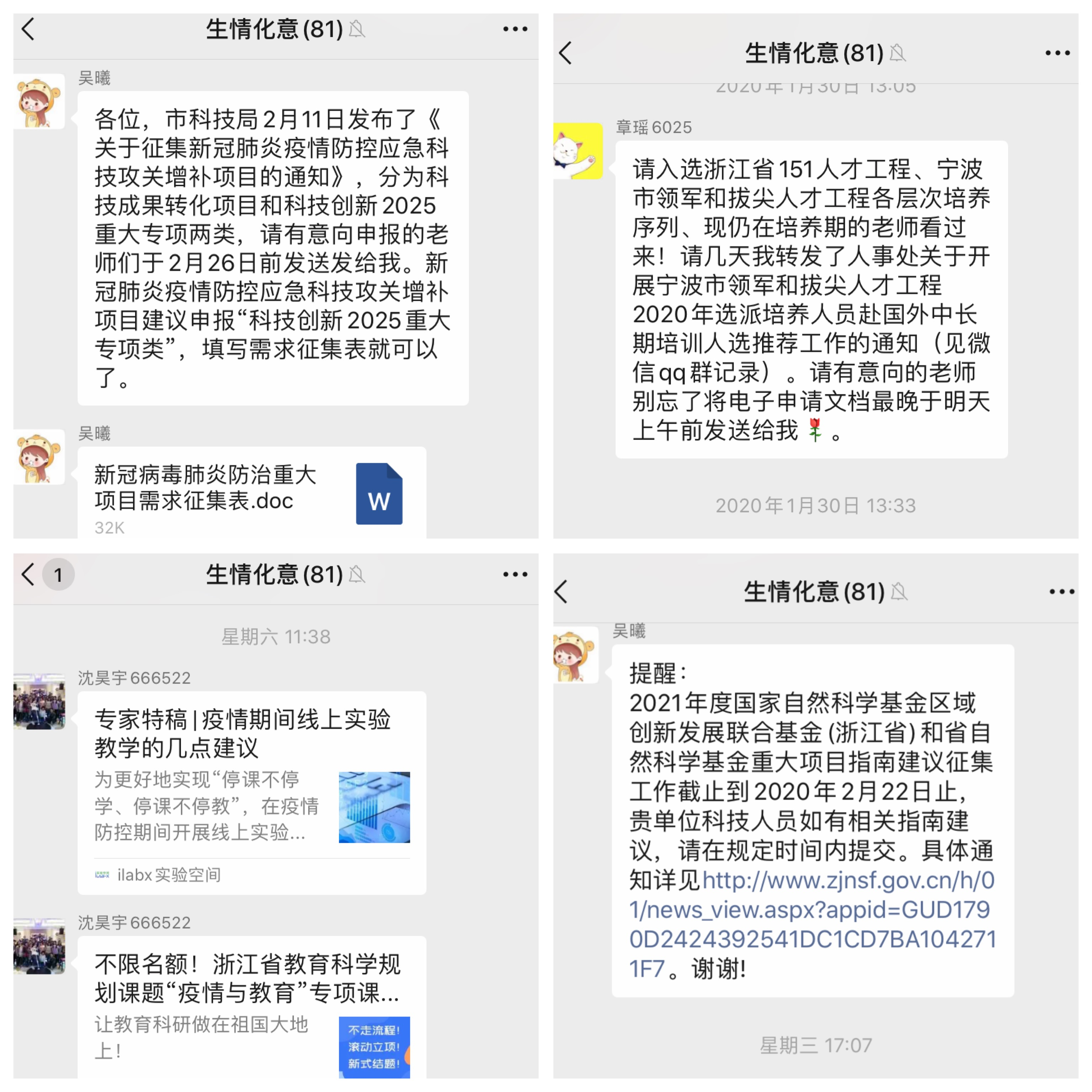 奋战科研,从未停歇。国家自然科学基金、抗击新冠肺炎专项课题、新冠肺炎防护科技攻关项目、省自然科学基金重大项目、疫情防控与教育教学专项课题等一个个的申报工作是生化学院教工群里出现最多的讨论话题,虽然因为疫情影响,很多实验研究停滞了,但是科研并没有停歇下来。宅家做研究反而给了很多老师沉下心思考的时间,线上一个个观点和思路的碰撞成为生化教工交流的别样风景线。