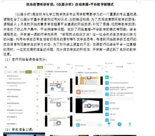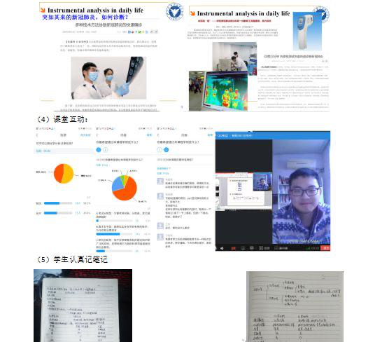 陈佳、沈昊宇、钟国伦、代冬梅组成的《仪器分析》课程建设团队,以“抗击疫情有你有我,《仪器分析》启动直播+平台教学新模式”为理念,克服疫情期间教学的困难,课程组1月底就完善原有在超星平台建课的网络资源,补充了录播、视频等教学资源;并启动了防止用户集中,平台拥堵等问题,做好了网络直播+平台教学新模式等预案。结合课程思政,率先采用“新冠肺炎检测方法”这一社会热点激发学生们学习的兴趣,利用与学生日常生活密切相关的素材等引发学生思考。