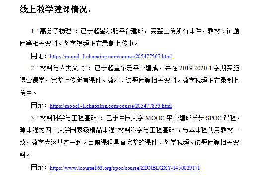 生化学院方征平、邓萌、闫红强、程捷、陈飞组成的团队高度协同,聚焦专业学习的基础理论与核心知识,兼顾公选课需要,分别在线构建“高分子物理”“材料科学与工程基础”“材料与人类文明”课程群。团队克服时间短、任务重,资源少、硬件缺,网络限制、软件限制等困难,抓住机会促进课程转型升级,做好信息时代的教学改革。