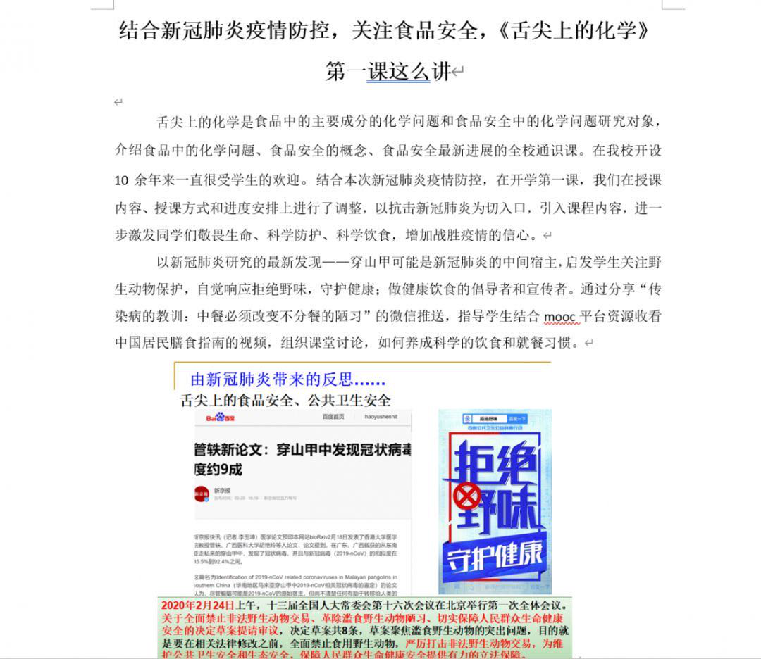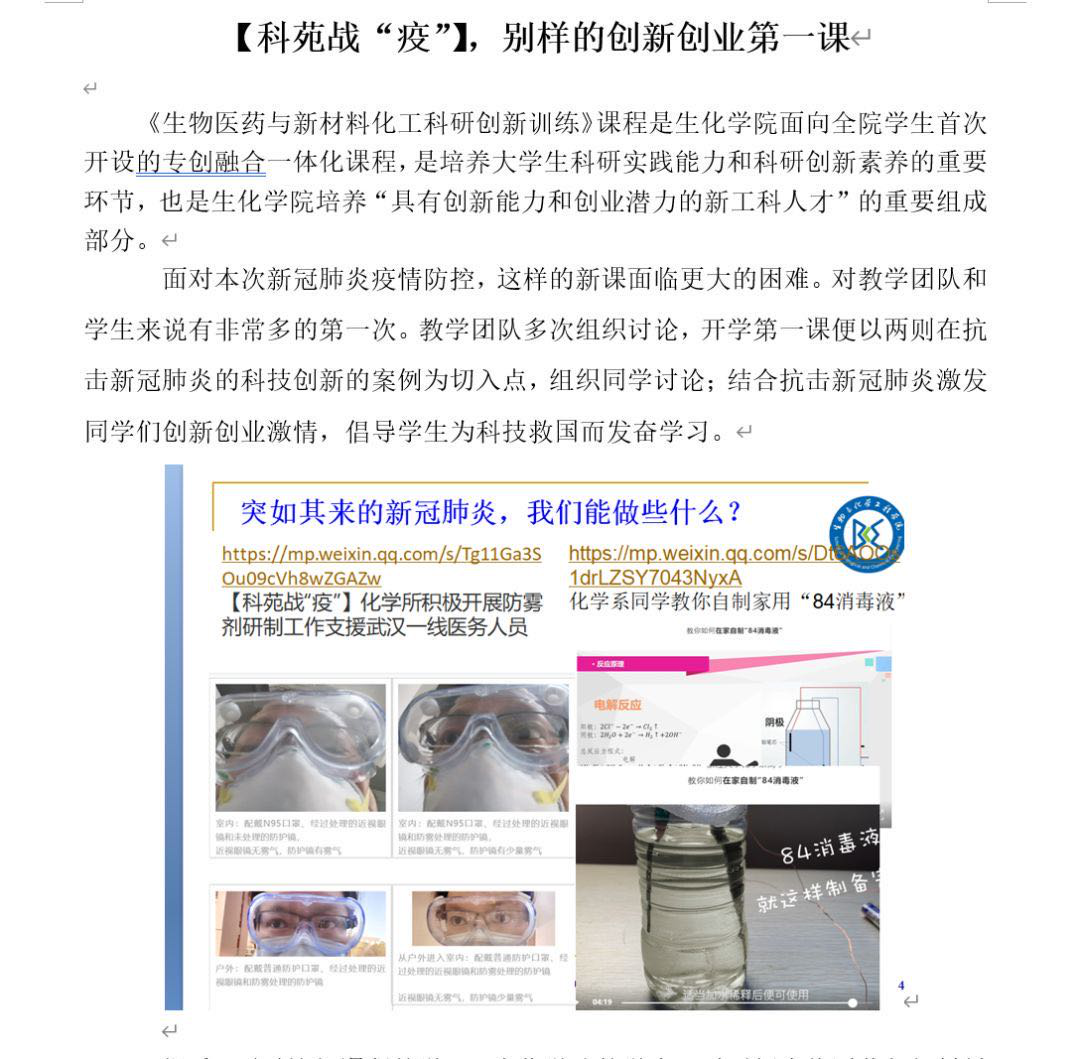 学院副院长沈昊宇授课的《舌尖上的化学》,结合新冠肺炎疫情防控,关注食品安全,启发学生关注野生动物保护,自觉响应拒绝野味,守护健康,做健康饮食的倡导者和宣传者。在《生物医药与新材料化工科研创新训练》授课中,以在抗击新冠肺炎中的的科技创新案例为切入点,组织同学讨论,激发同学们创新创业激情,引导同学们学好专业课,培养创新思维,为科技强国而努力奋斗。