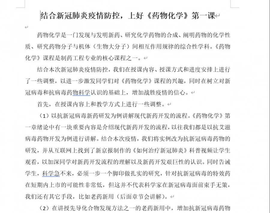 化工与制药研究所所长邹建卫以抗新冠肺炎药物开发为例利用网络平台动态讲解新药开发流程,将原本生涩难懂、教学难度大的《药物化学》讲得栩栩如生,在提高同学们对新冠病毒和抗病毒药物科学认识的基础上,增加了大家战胜疫情的信心。同学们纷纷表示“闻之色变”的新冠病毒并不可怕,药物研发之路是利国利民之路,是一个可以毕生追求的阳光行业。