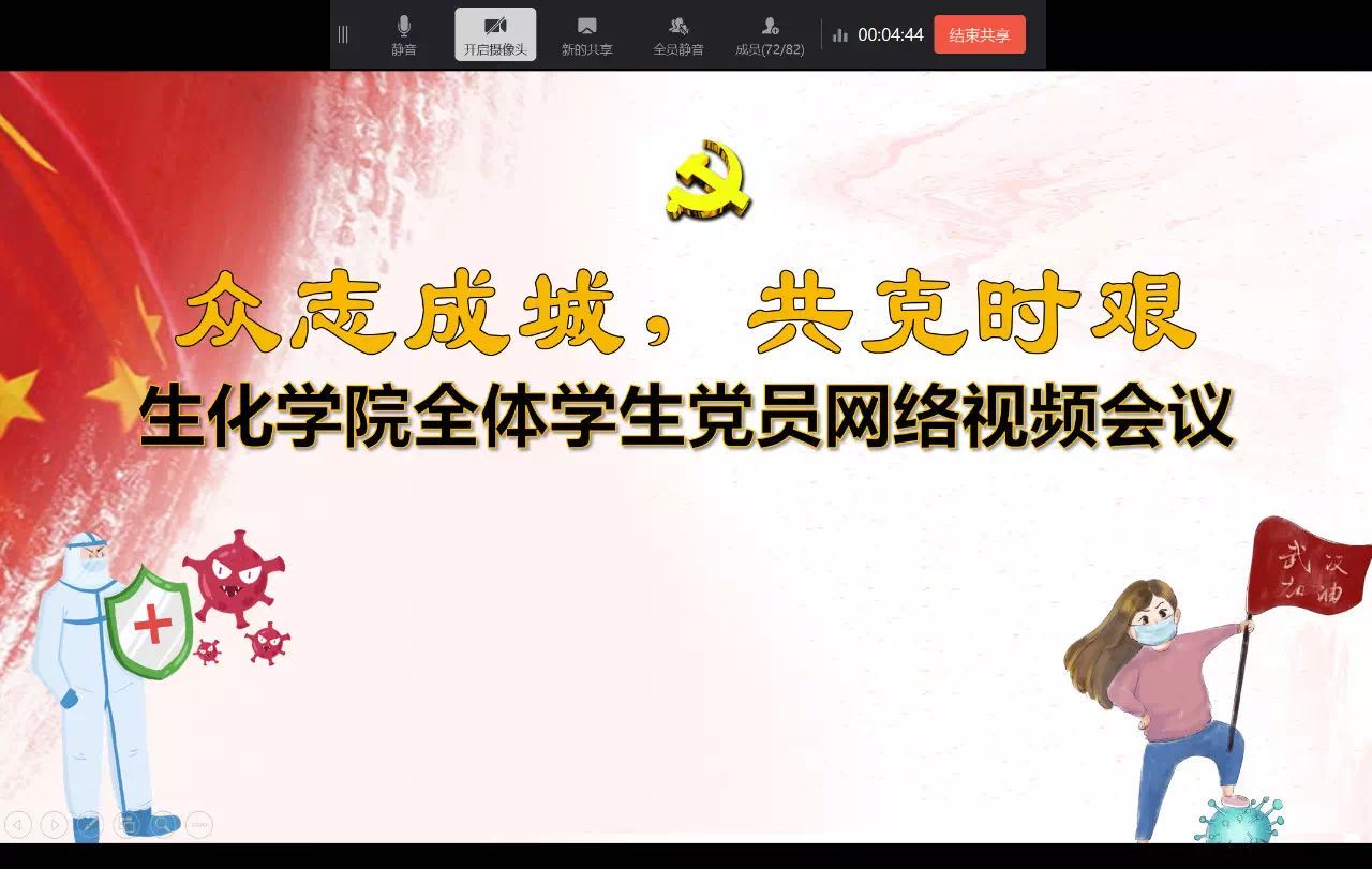 此外,开学第一周各班级以“抗击疫情”为主题纷纷开展了网络班会,各团支部开展“众志成城,生化战‘疫’”线上主题团日活动,共同吹响生化学院青年爱国战“疫”青春集结号。