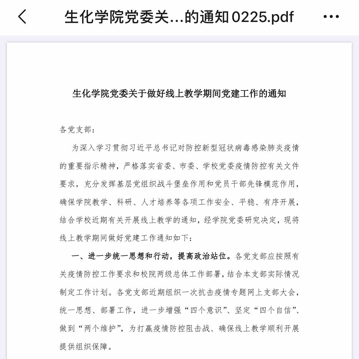 学院党委第一时间做出行动,下发《生化学院党委关于做好线上教学期间党建工作的通知》,从七个方面做出明确要求,确保疫情防控期间党建工作进一步加强提升,成为学院全面战“疫”的中流砥柱。