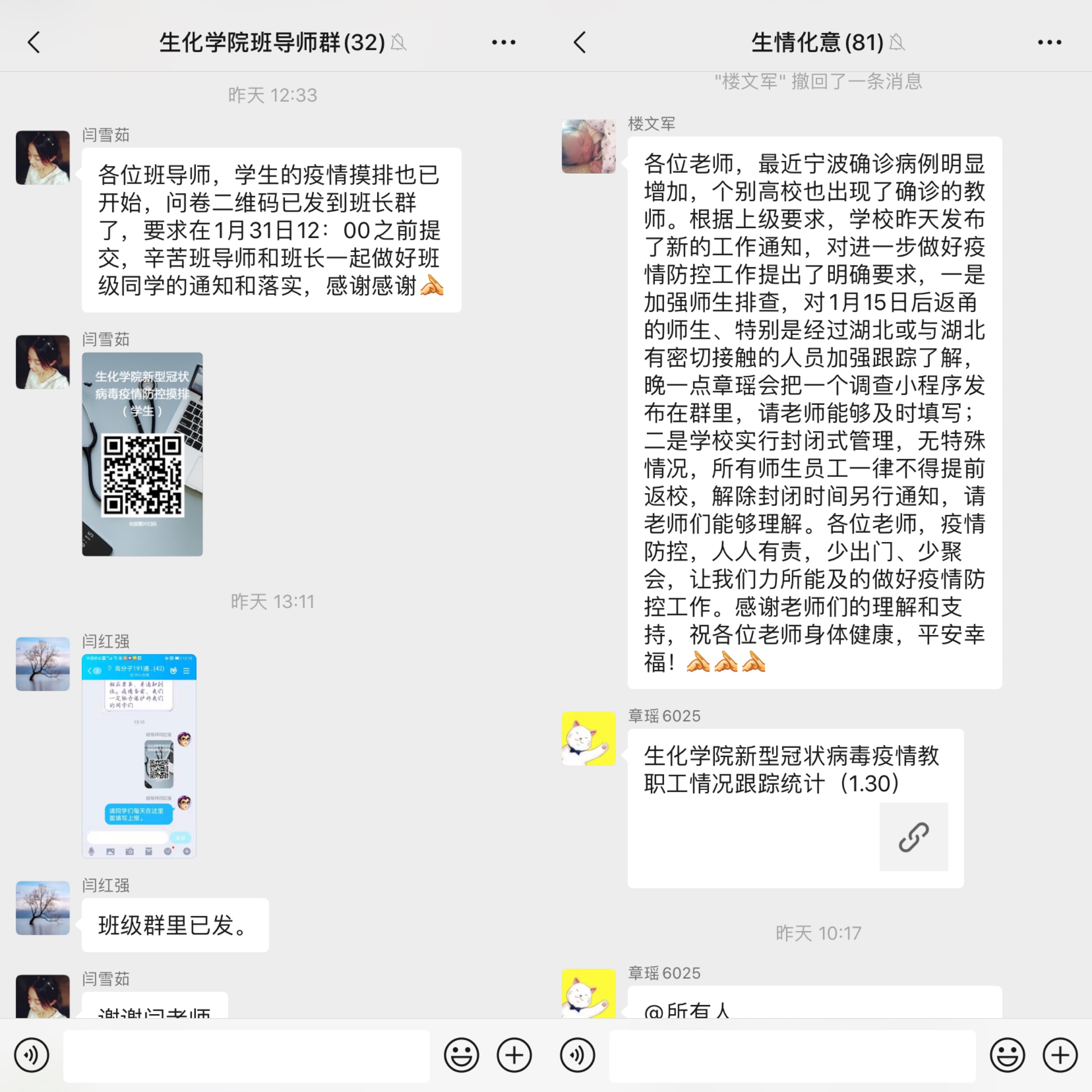 生化学院在疫情排摸工作中群策群力,发挥党员的骨干作用,排摸工作责任制,重点区域片区制,进一步压实责任担当,确保数据准确无遗漏,重点跟进有专人,疫情防控无死角。