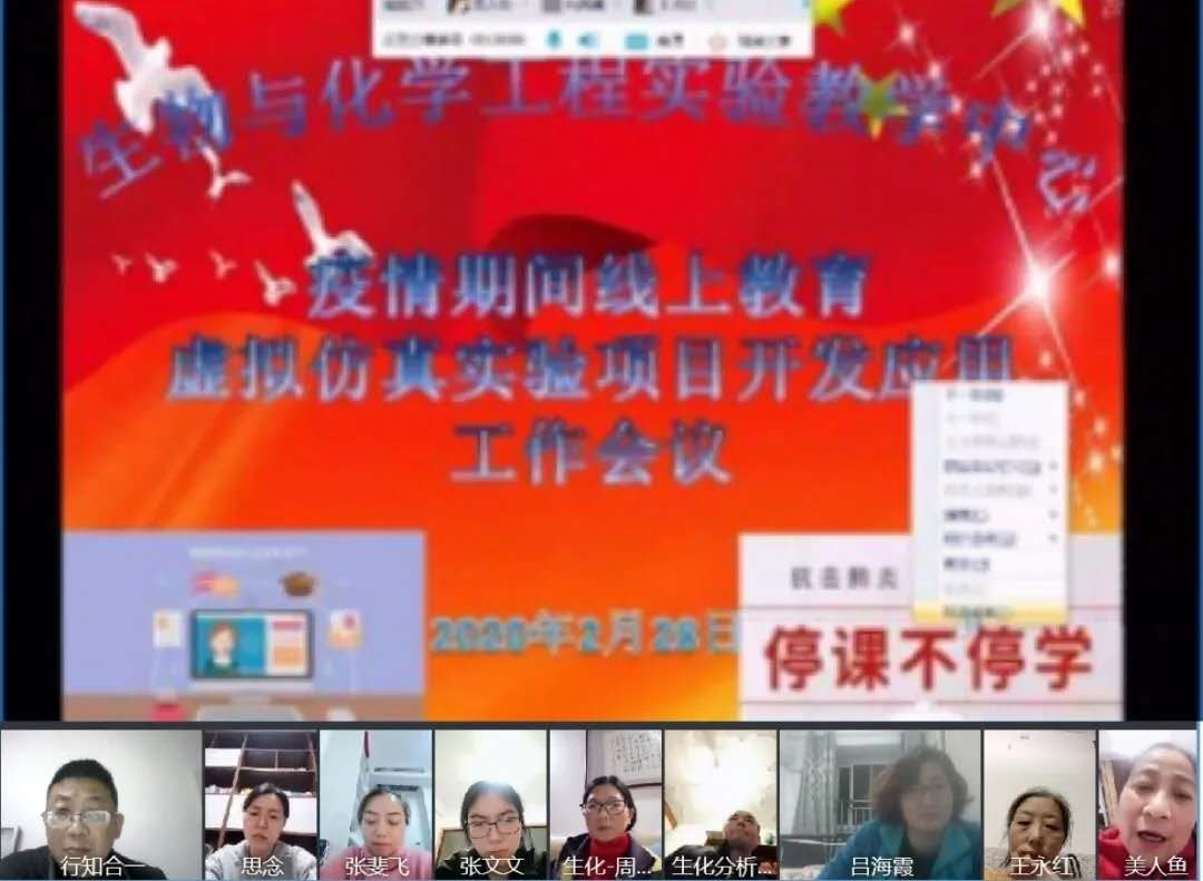 疫情期间,实验中心召开线上教学和虚拟仿真实验项目开发应用工作会议。各位老师畅所欲言,提出虚拟仿真实验软件在使用中的问题和解决方案。同时认真安排疫情防控期间教学工作,确保实验教学科学有效,教学质量标准不降低。