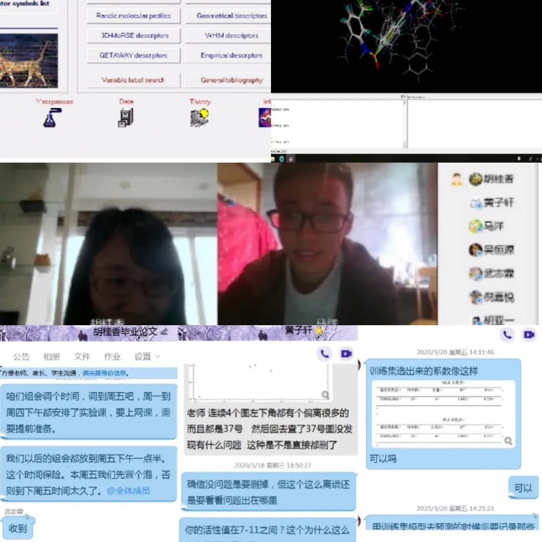 线上组会忙分享,论文进度有保障。胡桂香老师指导的毕业论文小组则选择了药物设计相关课题,利用软件设计进行数据计算,通过网上视频、共享屏幕、远程操作、拍摄小视频等方式推进毕业论文进度。小组定期每周通过网上视频开展组会,同学们轮流汇报自己的研究进展,并通过共享屏幕等方式相互交流探讨,老师则通过拍摄小视频来传授软件操作方法并布置下一周的论文进度要求。