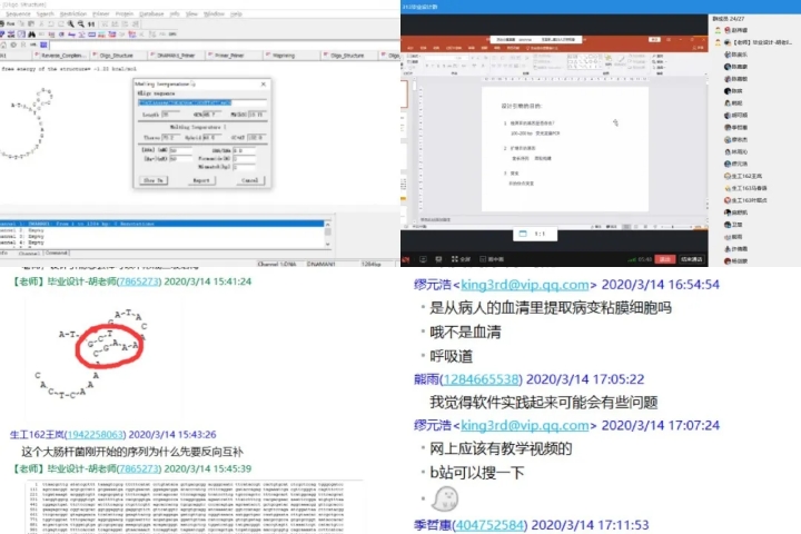 复试毕设两手抓,鱼和熊掌可兼得。生物工程专业胡升和赵伟睿两位教师为了帮助毕业生更好的完成毕业设计,针对课题组考研学生较多要准备考研复试的情况,将毕业设计的实验与复试可能要面临的问题有机结合。就基因克隆与表达、蛋白质纯化与性质坚定、微生物发酵等常规实验的原理、流程和注意事项进行了线上的模拟展示。同时,两位老师还上传了往届学生联系导师的邮件模板和个人简历模板,指导同学撰写个人简历和研究生导师联系邮件,并且对同学们的简历和联系邮件进行修改和润色。