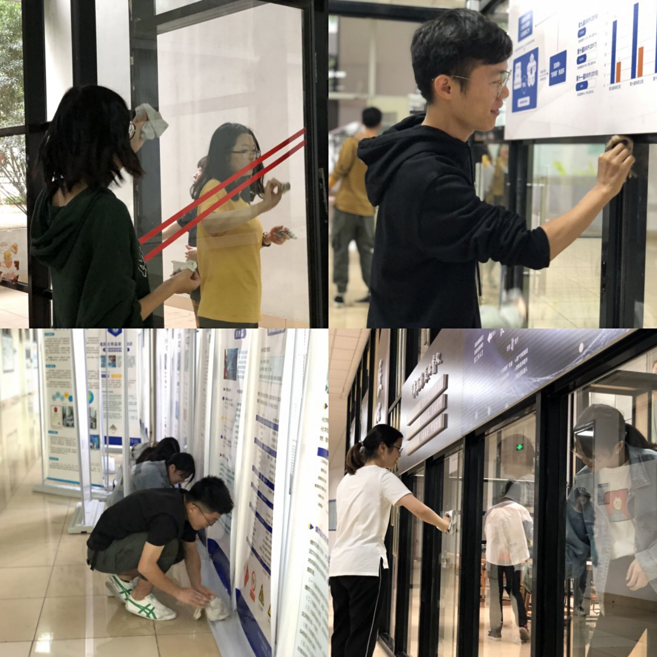 生化学院三个学生党支部分别负责不同楼层的打扫。清理教学楼过道的同学率先开始清理工作,他们对过道每一处进行细微入至地打扫,尽力创造出一个“一尘不染”的大环境;负责清理宣传和玻璃的同学对它们的缝隙角落进行着重清理;而摆放标语牌的地面等一些平时很难清扫到的地方,同学们在搬走标语牌后对其进行细致地打扫;其余负责清理标语牌和办公室铭牌的同学努力让牌子变得崭新。经过同学们近一个小时的努力后,生化学院变得焕然一新。