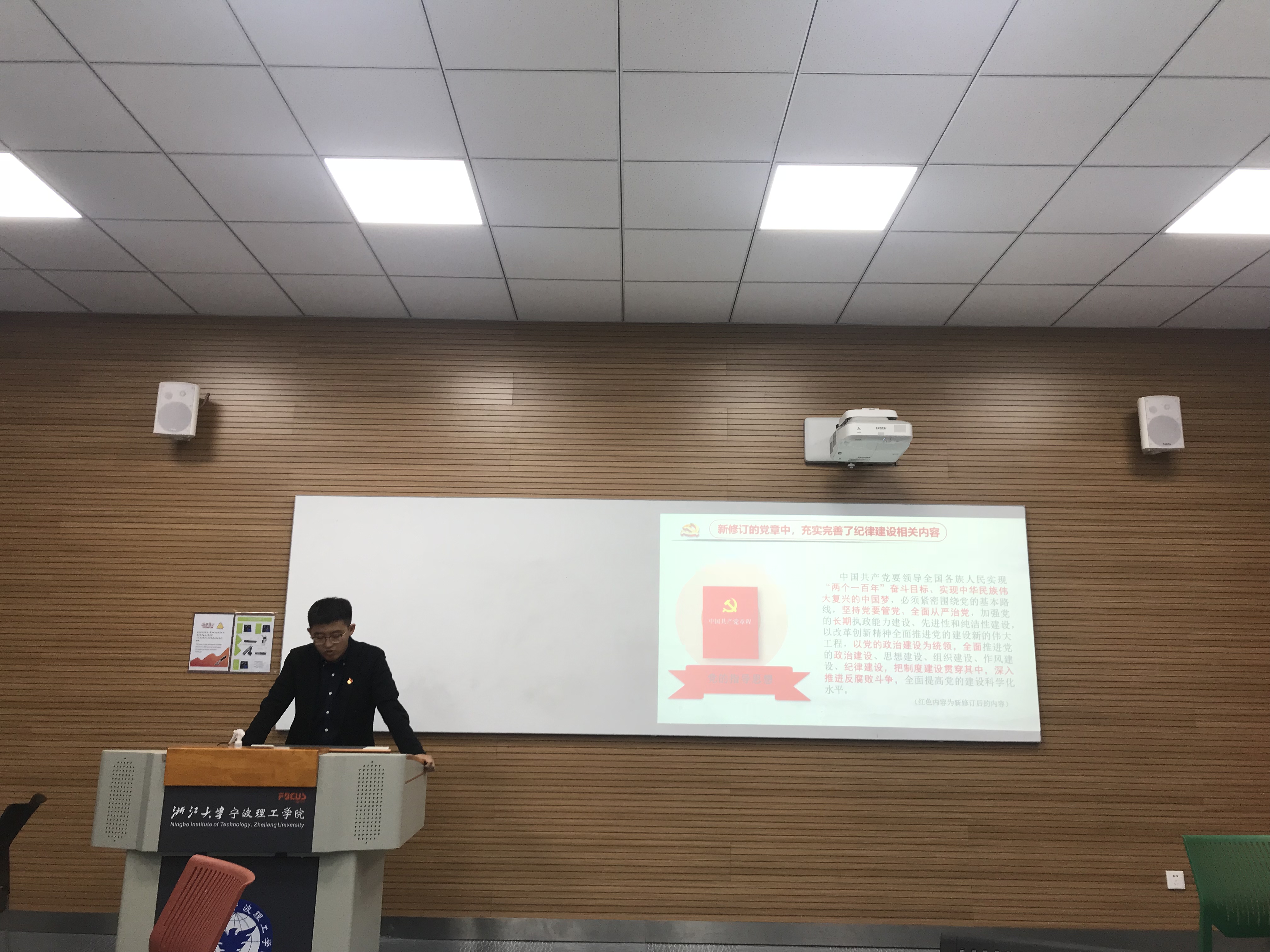 党的力量来自组织,而组织要形成凝聚力,就必须有内在严密的纪律。党的十九大之后,党中央颁布实施了新修订的《中国共产党纪律处分条例》,对全面从严治党、加强纪律建设进行再部署、再动员。学校党委把握党的建设规律,在11月8日下午,生化学院学生第一党支部书记李桢作了题为“用铁的纪律管党治党”主题党课。