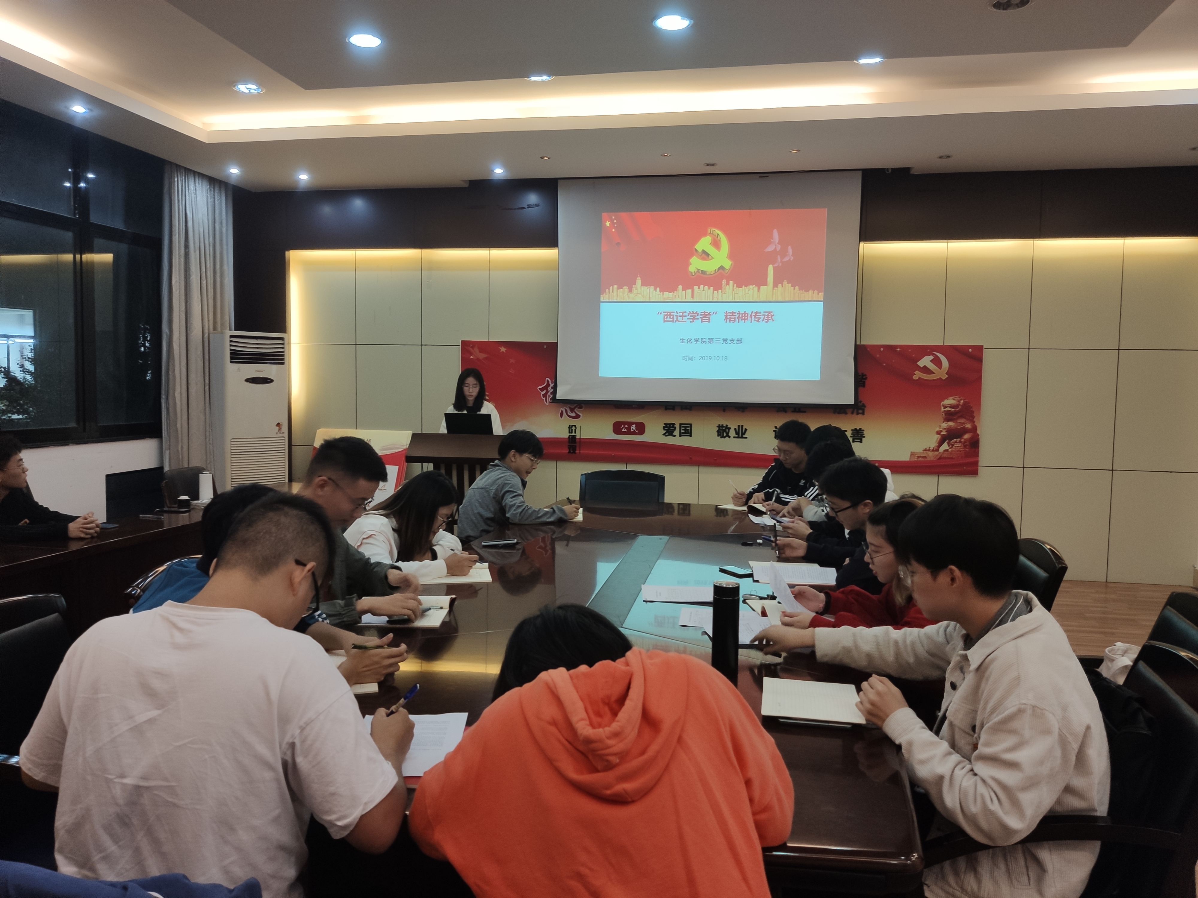 为扎实推进“不忘初心,牢记使命”主题教育,生化学院学生第三党支部坚持真学静悟,真思笃行,2019年10月18日以微型党课的形式开展主题为学“西迁人物”党日活动,聚焦西迁历史,分享求是精神,在历史中忆初心,在精神中话使命。
