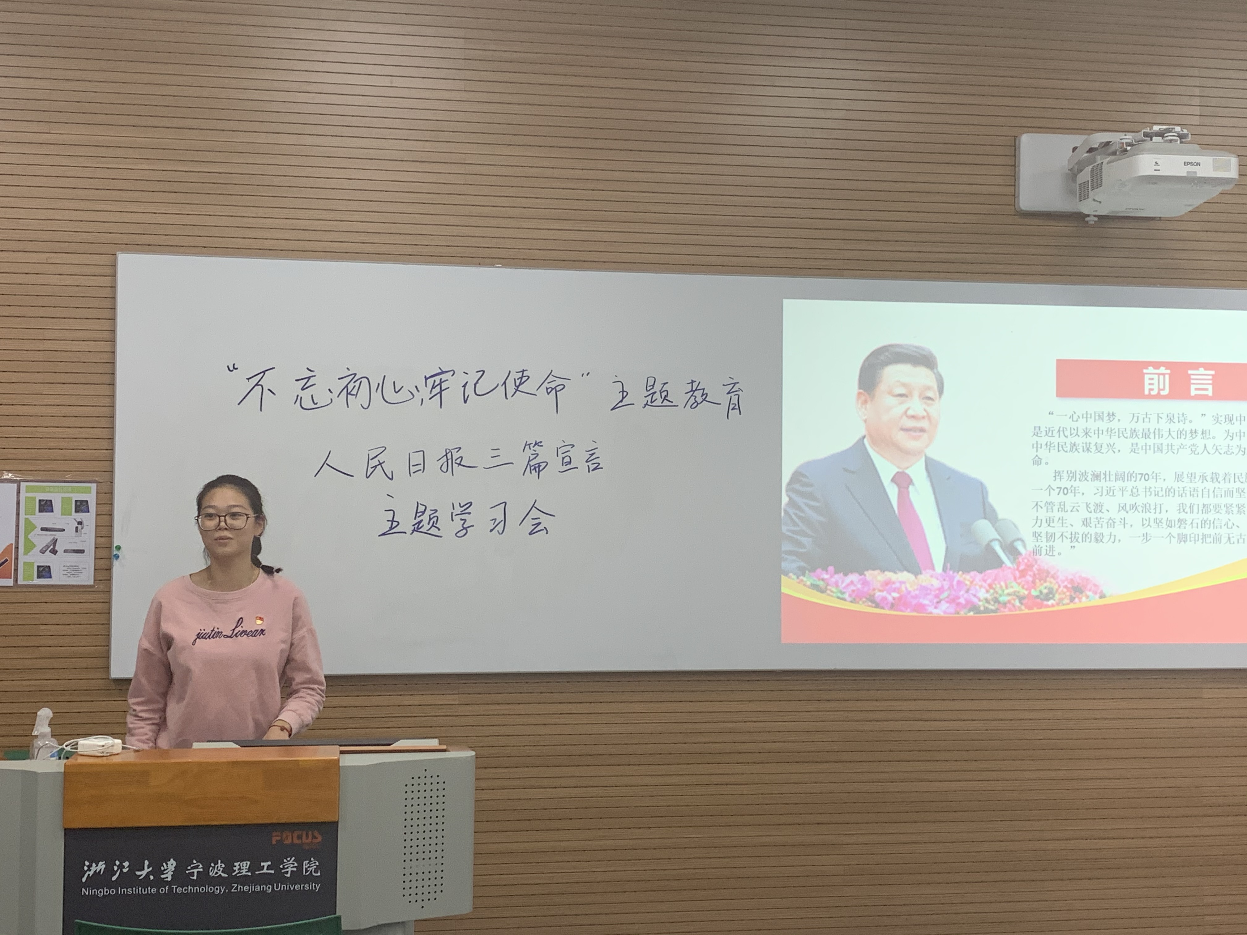 此次党日活动通过学习人民日报发表的三篇“宣言”,每组学生党员以PPT答辩的形式进行宣言解读和学习心得分享。在展示过程中带着大家回望了新中国七十年来的披荆斩棘、风雨兼程,也深刻体会到了中国共产党人矢志不渝的初心和使命,共同见证了中国如今的辉煌与成就,盛满了对新时代中国特色社会主义的期待。更加意识到“未经黑暗,便不见光明的可贵;历经磨难,才深知复兴的意义。”