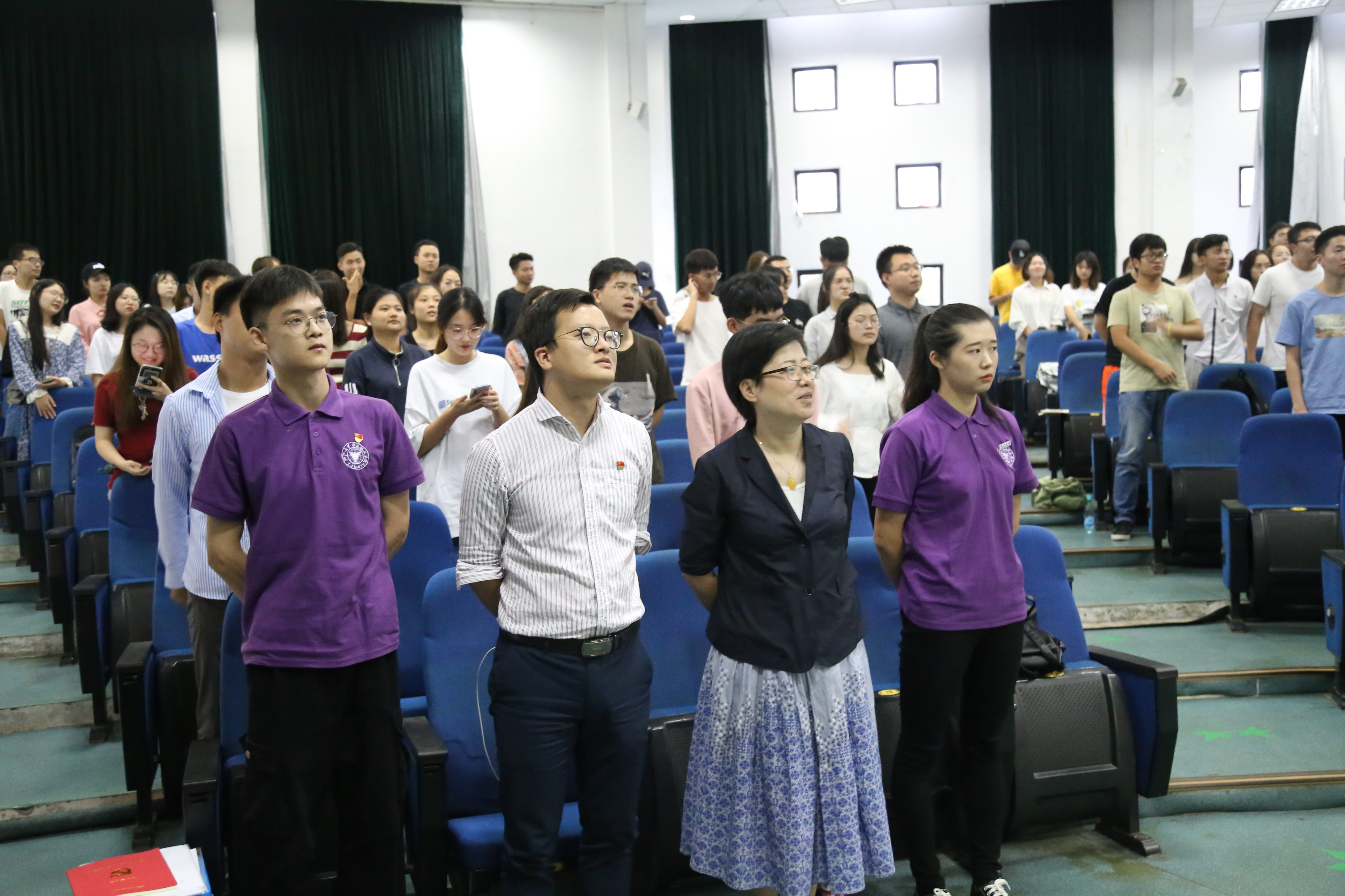 全体起立,奏唱庄严肃穆的国歌之后,会议正式拉开序幕。首先是“求是黔进”宣讲团学生代表生物工程181班许杰上台分享了他和团队暑期赴黔的西迁之路。今年夏天,他们前往贵州省遵义市湄潭县,追寻着浙大的西迁之路,触摸历史遗迹,重温求是精神,他们是求是魂的践行者;作为求是学子,了解浙大精神,宣讲西迁文化,他们也是求是魂的传播者,浙大精神在他们身上焕发出了新光彩。他希望在座的每位学子都能加入到宣讲队伍中来,不忘初心,将求是精神传承下去。