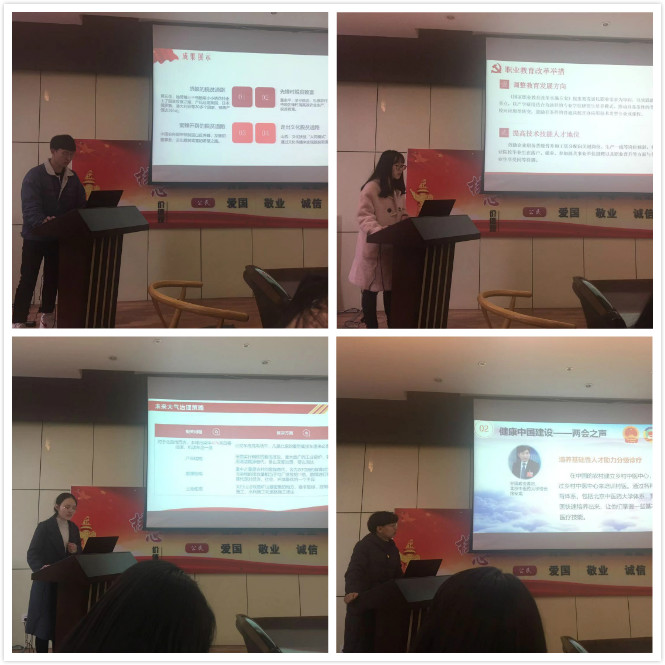 活动开始,闫雪茹首先从“两会”的历史、性质、内容、意义四个方面向参会党员进行了讲解,明确了“两会”的重要地位和非凡意义,强调“两会”是倾听民声的会议,是凝聚智慧与力量去实现国家各项发展的会议。随后,支部党员针对本次“两会”的热点问题进行了微党课大赛,通过提炼前期收集的资料,整合核心内容,党员们以生动多样的方式对热点问题进行了宣讲和解读,内容涵盖正风反腐、全面依法治国、教育改革、健康中国、收入分配、脱贫攻坚、住房制度,生态环保八个方面。过程中全体党员表现出了高度的学习热情,现场气氛十分活跃。
