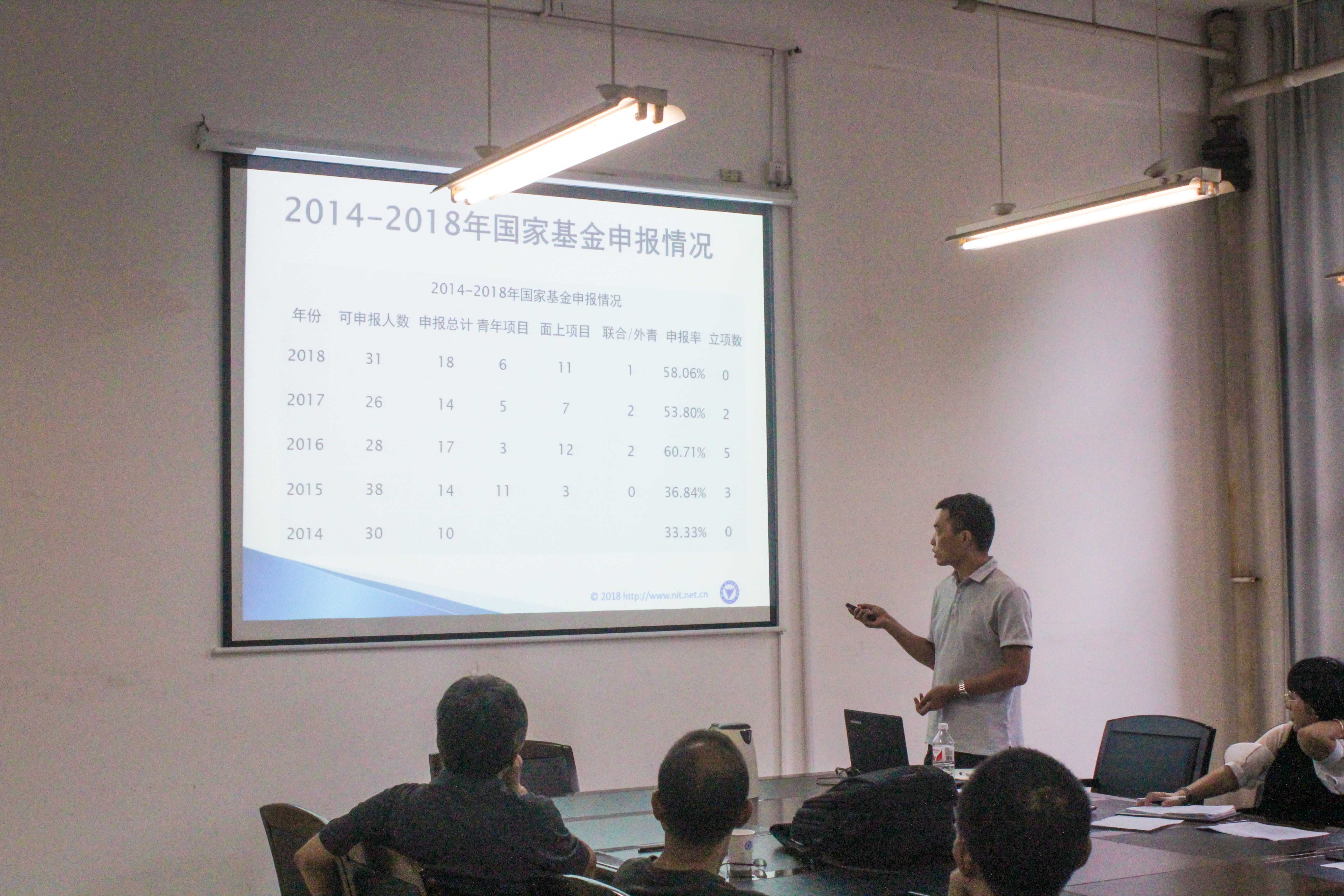 学院院长方征平教授作动员讲话:国家级项目是体现教师学术水平的重要指标,希望大家从思想和行动上高度重视,尽早准备,精心谋划,提高申请质量,争取2019年国家自然科学基金项目有新的突破。学术委员会主任蒋德安教授分享了自己在基金申请和评审过程中的经验与体会,介绍了申请书撰写要点以及注意事项。高章华教授对学院近五年国家自然科学基金立项情况进行了介绍,就基金项目现状、存在的问题及原因进行了深入分析和说明。