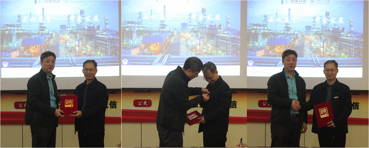 在王高合处长对徐保岳总经理作了介绍后,胡征宇书记对徐总经理的加盟表达了热烈欢迎,并为其颁发聘任证书、佩戴校徽。随后徐保岳总经理为大家作了题为“石化行业,中金发展”的主题讲座,他详细介绍了宁波中金石化有限公司的发展历程、中国石化行业现状及发展规划、企业如何适应行业发展等内容,还结合个人经历与大家分享了多年以来的宝贵管理经验。