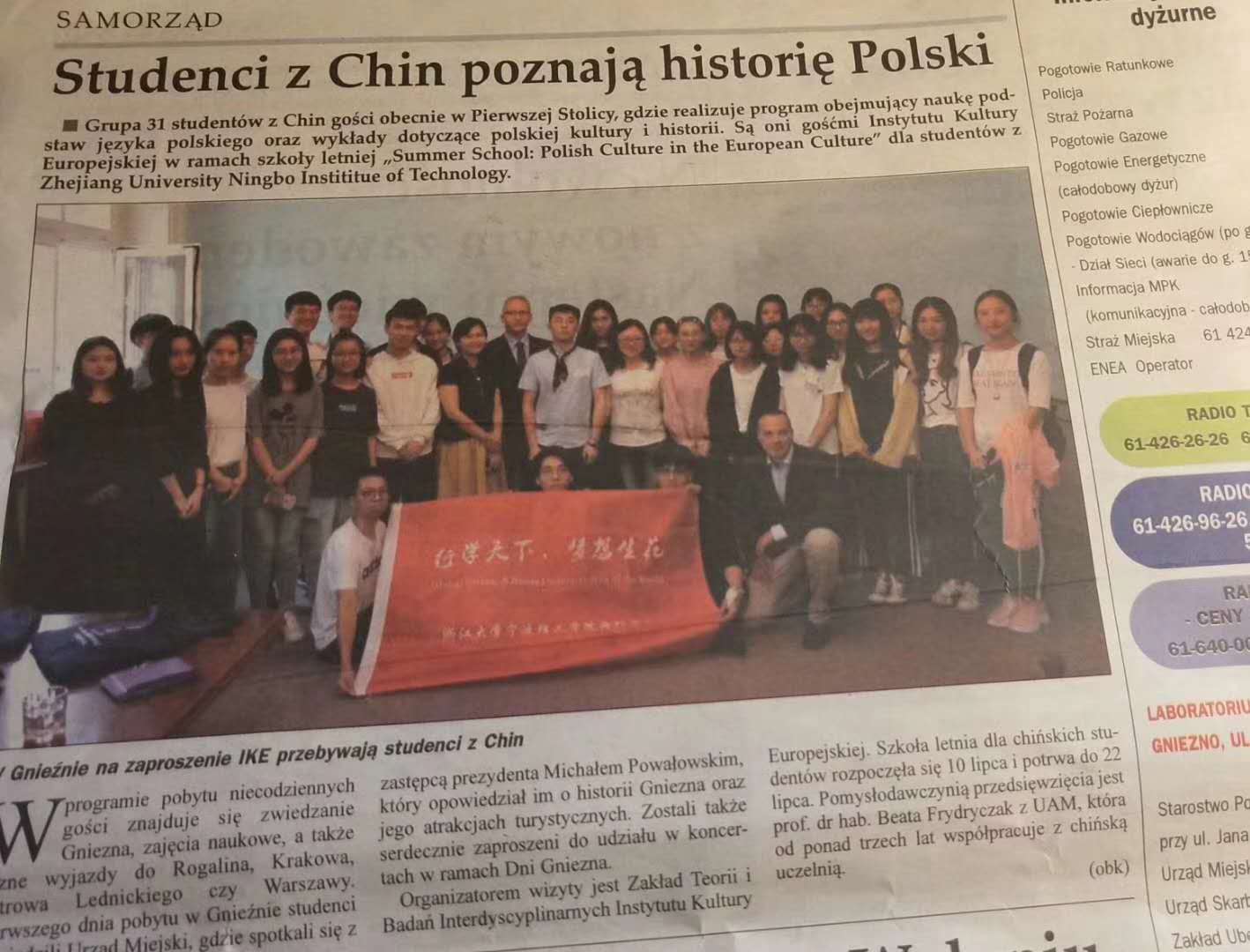 7月11日上午,密兹凯维奇大学欧洲学院院长Beata教授为交流团举行隆重的欢迎仪式,并赠送了AMU校服作为纪念品。之后,波兰团来在市政大厅,接受了格涅兹诺市长的接见和款待,并得到了波兰当地媒体的头版报道,如此高规格的欢迎仪式,让每一位波兰团成员即惊喜又意外,对接下来的两个礼拜的访学生活更是充满了美好的期待。