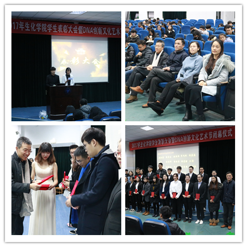 2017年1月3日晚18:30,生物与化学工程学院于NF103举办生化学院2017年优秀学生(集体)表彰大会暨DNA创新文化艺术节闭幕仪式。生化学院院长方征平教授、党总支副书记楼文军老师、全体辅导员出席此次表彰大会,获奖的优秀学生、先进集体代表和各班级学生代表参加此次表彰大会。大会由生化主持队李丹晨与吴辉两位同学担任主持。